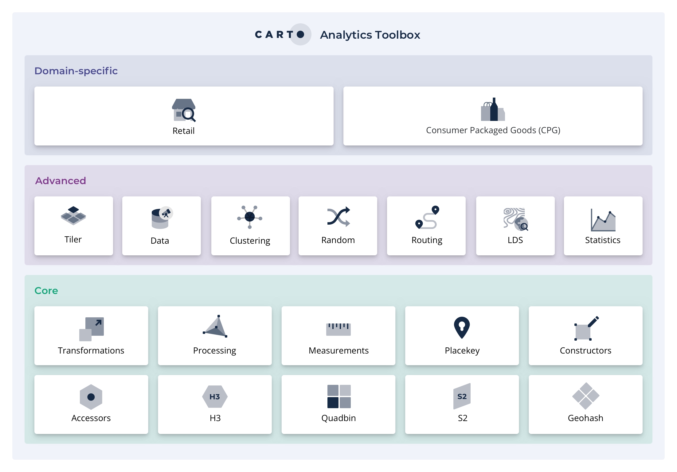 The Analytics Toolbox contains more than 100 advanced spatial functions, grouped in different modules. For most data warehouses, a core set of functions are distributed as open source, while the most advanced functions (including vertical-specific modules such as retail) are distributed only to CARTO customers.