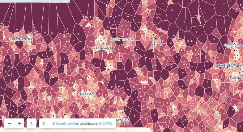 Voronoi diagrams are a very useful tool to build influence regions from a set of points and the Analytics Toolbox provides a convenient function to build them. An example application of these diagrams is the calculation of the coverage areas of a series of weather stations. In the following query we are going to calculate these influence areas in the state of New York.