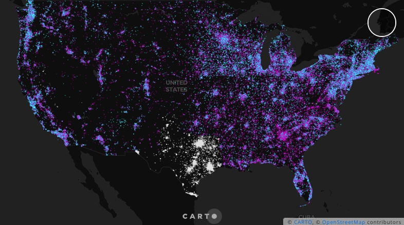 In this example we are creating a tileset in which every inhabitant in the US is represented by means of a point. Each point is tagged with a vaccinated (blue) or non-vaccinated (purple) tag. This visualization enables us to depict at a glance which parts of the country are progressing better with the vaccination rollout.