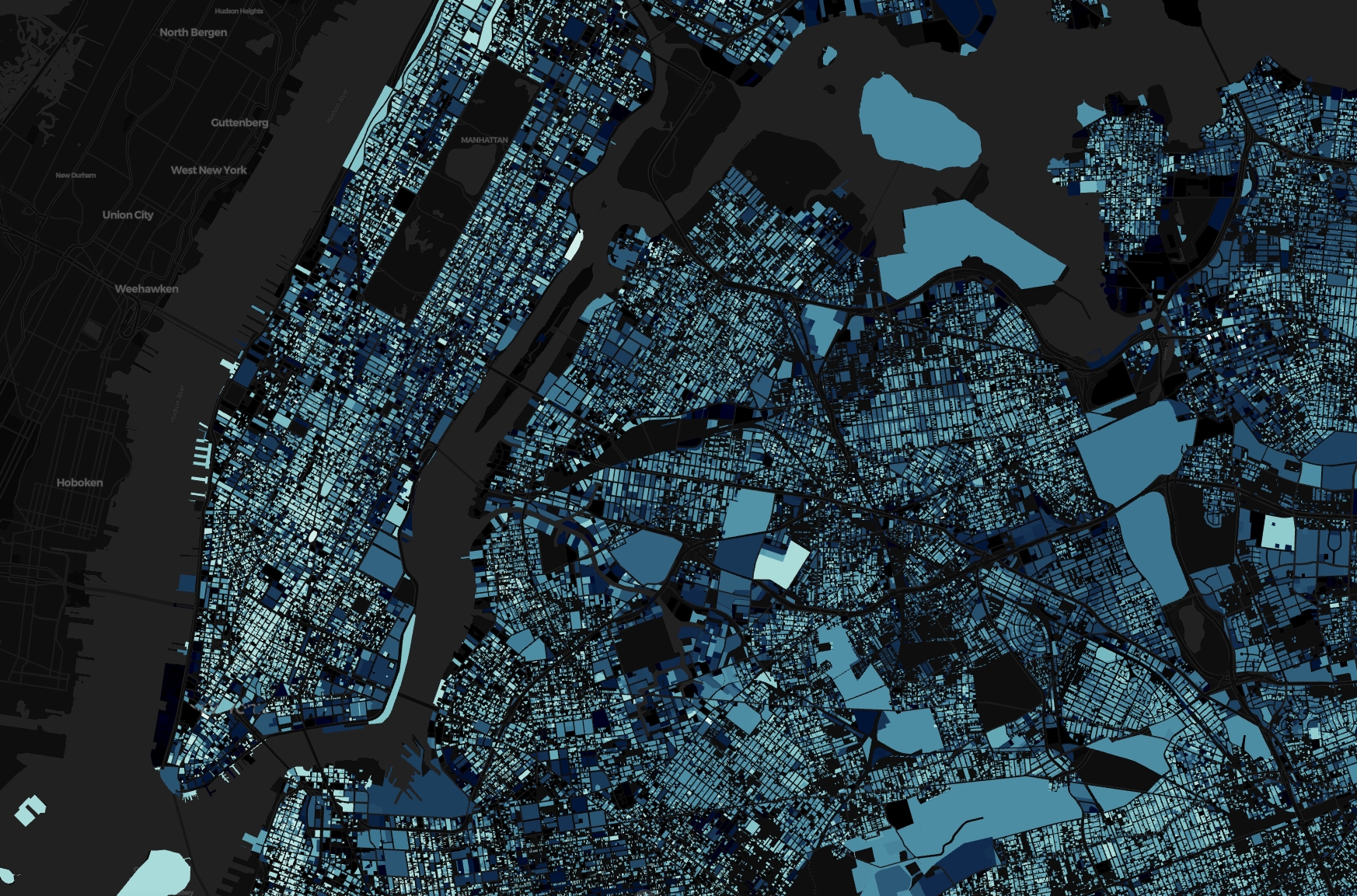 This example shows in a very effective manner the historical growth of New York City by means of the year of construction of its more than 800K buildings. The dataset has been obtained from the MapPLUTO repository of the NYC Department of City planning.