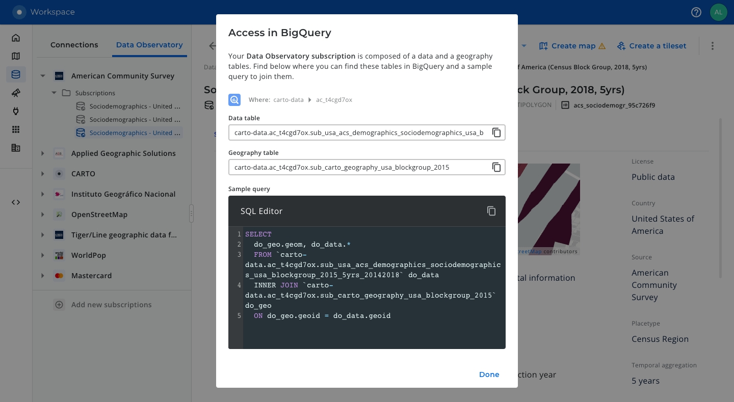 Navigate to the Data Explorer and expand the Data Observatory section. Choose any of the your data subscriptions and click on the “Access in” button on the top right of the page. Copy the BigQuery project and dataset from any of the table locations that you see on the screen.