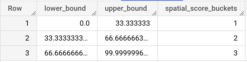 Additionally, a lookup table cartobq.docs.cpg_spatial_scoring_performance_lookup is provided as before to help interpretability. A POS with a score of 0 will always belong to the intermediate group, as the discretization is centered at 0. Notice that outliers are not considered when computing the upper and lower bounds of each bucket, but they belong to the closest bucket.