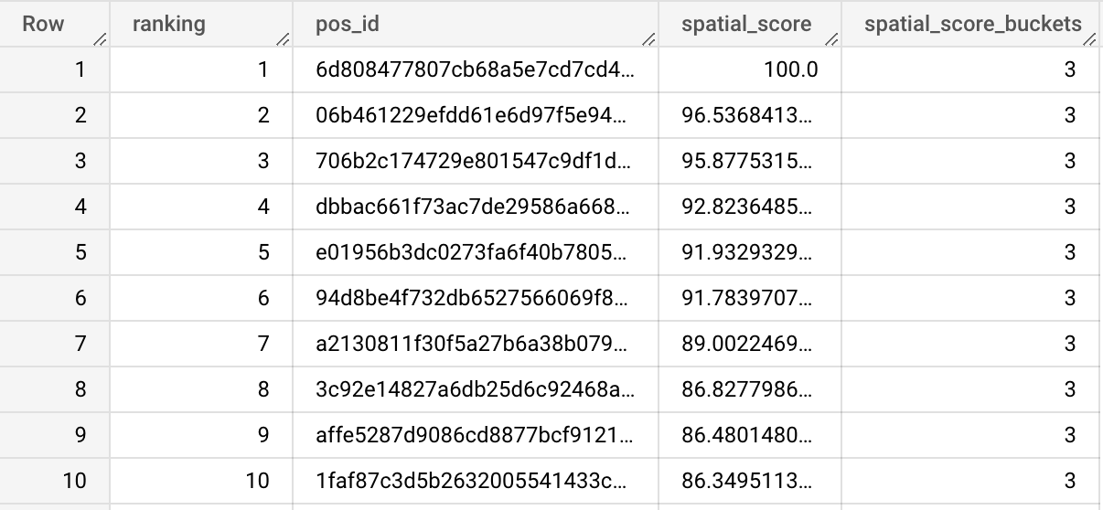 The output table <my-project>.<my-dataset>.cpg_spatial_scoring_attractiveness includes the POS' locations (pos_id) ranked (ranking) based on the derived spatial attractiveness score (spatial_score) along with their corresponding attractiveness level (spatial_score_buckets). Notice that the score is provided on a 0-to-100 scale.