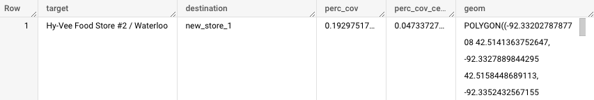 In our example, we’d like to quantify cannibalization through the population overlap between the new store’s catchment area and the existing ones. Therefore, we run the following query to get the data ready: