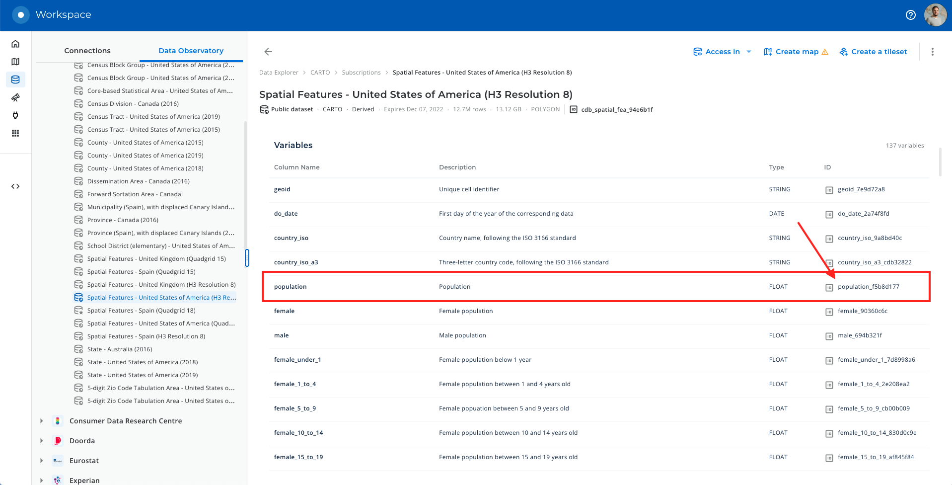 Variables from the CARTO’s Data Observatory subscriptions we’d like to use to quantify cannibalization. In this case, population. Note the variable slug is required which can be obtained using the Analytics Toolbox or on your workspace (see image below).