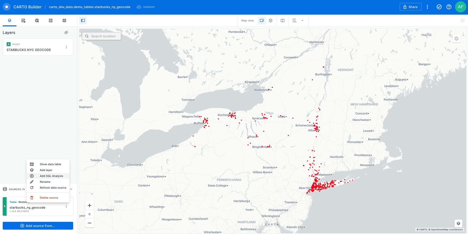 First of all, you should create a new map and add a source with the table including the locations around which you want to calculate isolines. You can find more details on how to create maps in Builder in the Maps section of the User Manual.