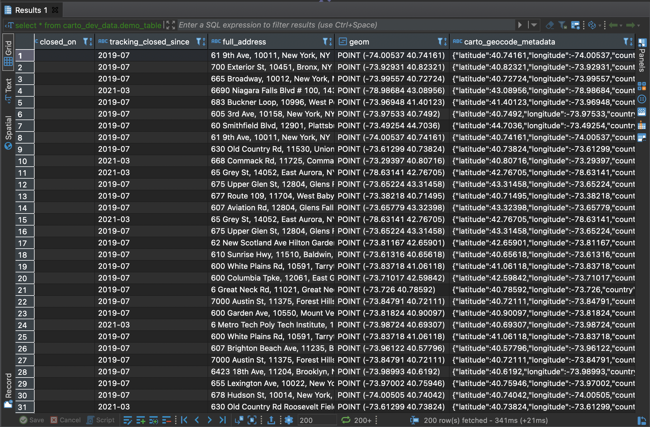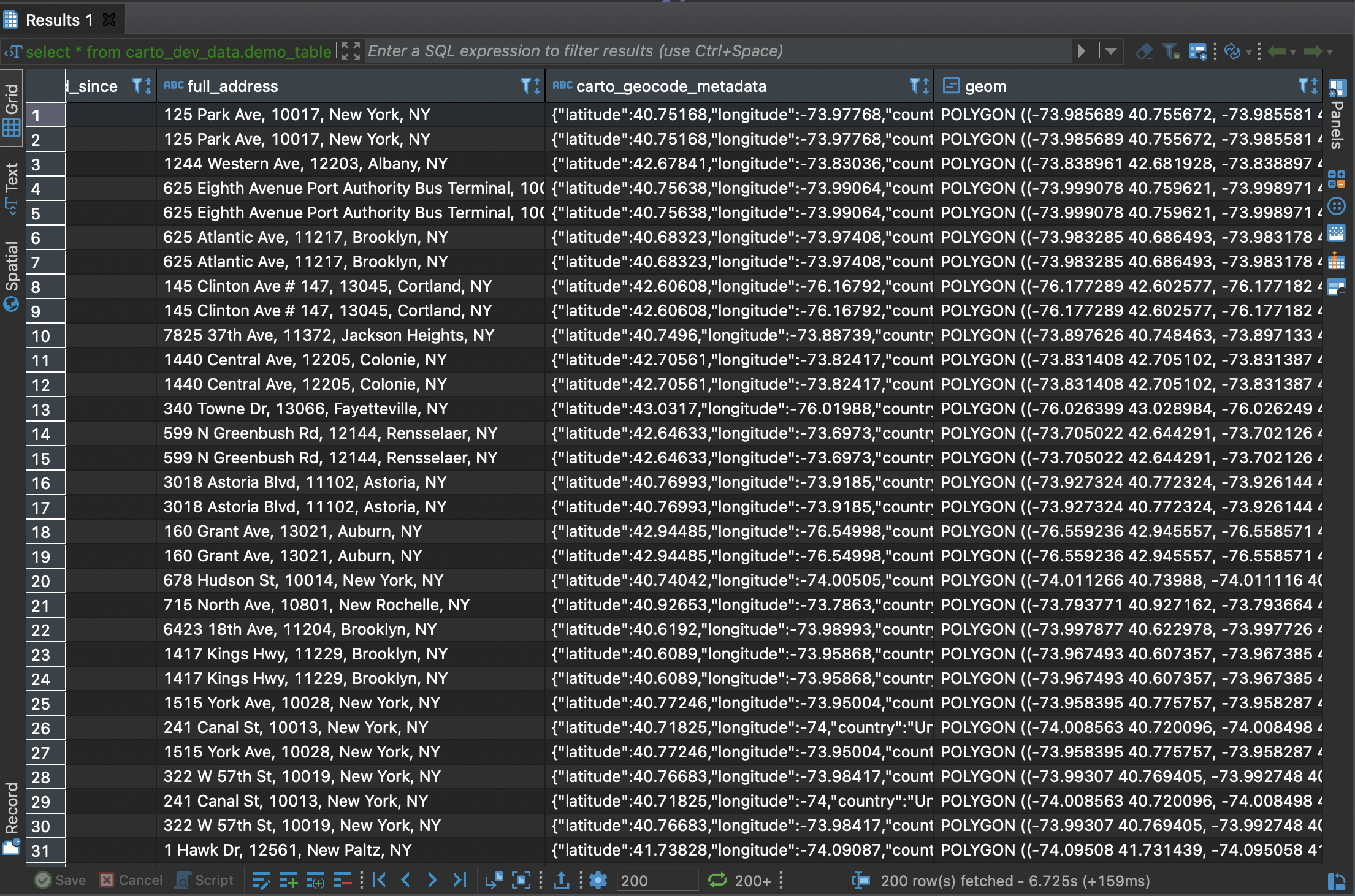 In the query we specify the output table in CREATE TABLE and next, in the SELECT, we call the ISOLINE() specifying “geom_tomtom” as column name for the origin geometry column, “mode” parameter on “walk” and “range_value” parameter to 900 seconds (15 min) in order to calculate the isolines based on 15 minutes walking. Last but not least, we need to use FROM call to specify the input table for the geocoding.