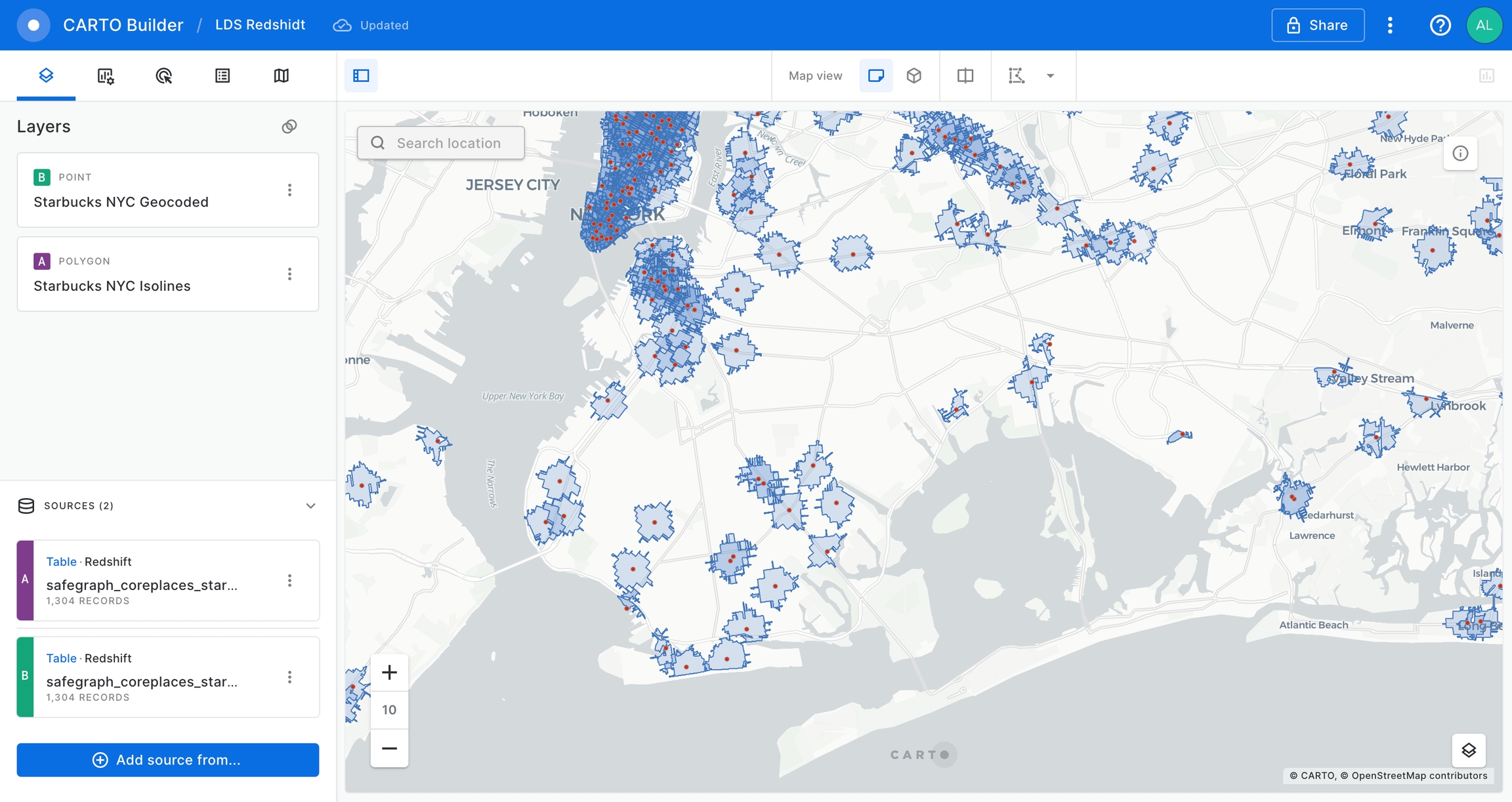 If you prefer you can create isolines without writing any line of SQL code thanks to our map-making tool CARTO Builder, which offers a user interface that you can use to calculate trade areas based on walk/drive times or distances. Let’s use it here to reproduce the same-use case as we have previously done from the SQL console, but from the Builder interface.