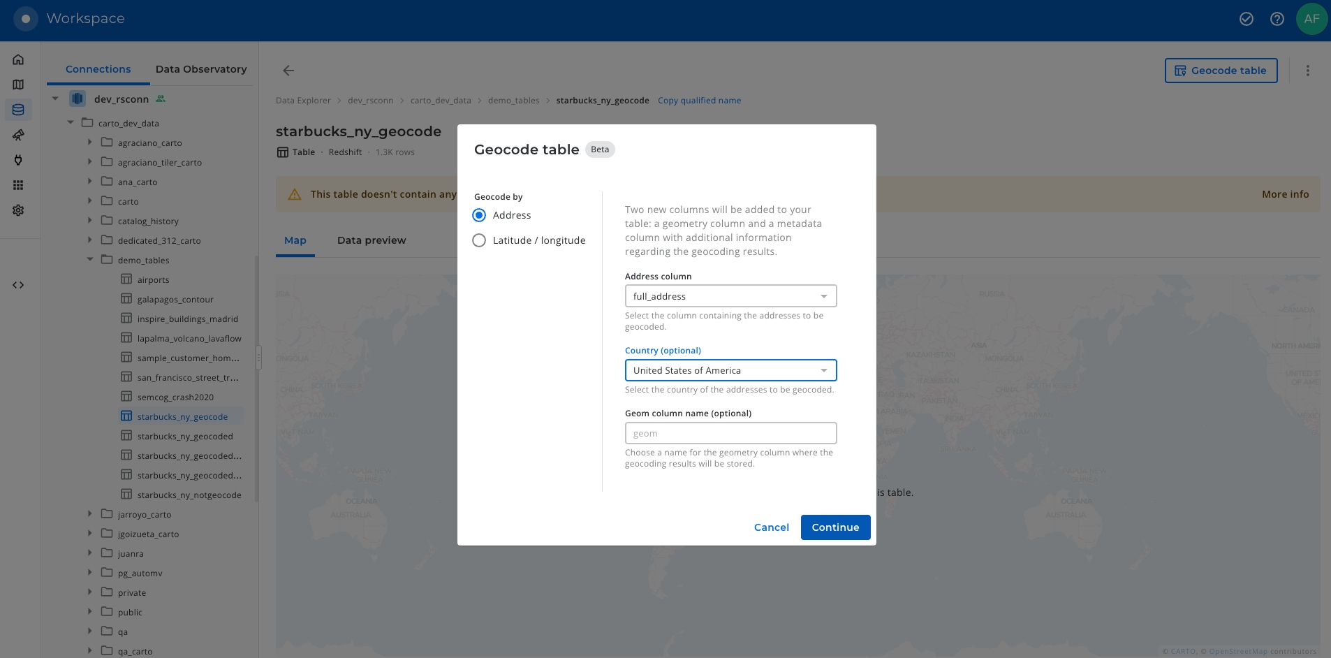 For this example we will use a table with the Starbucks addresses that can be found in the publicly available carto_dev_data.demo_tables.starbucks_ny_geocode . The table contains a column called “full_address” that we will use as input for the geocoding process.