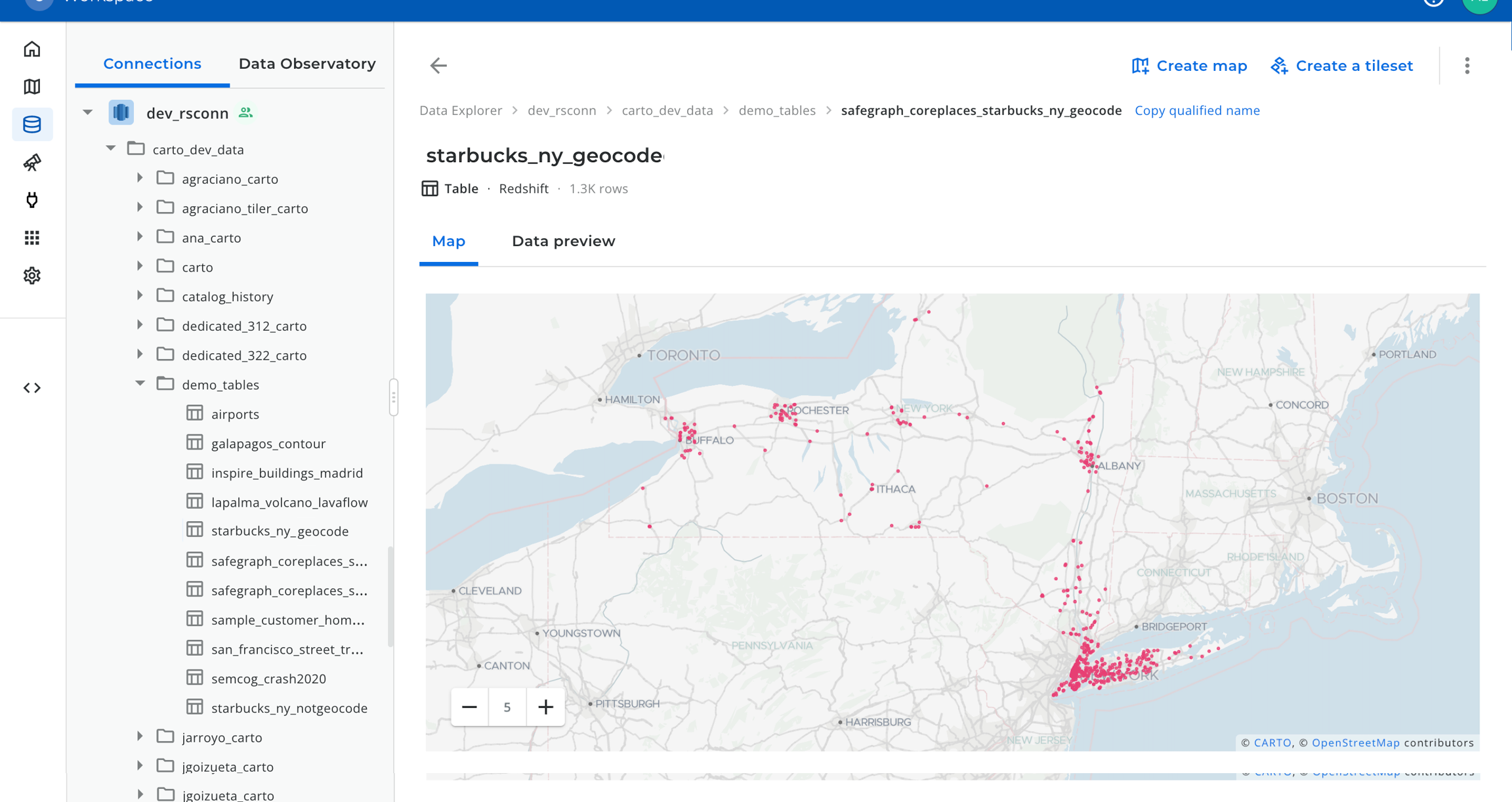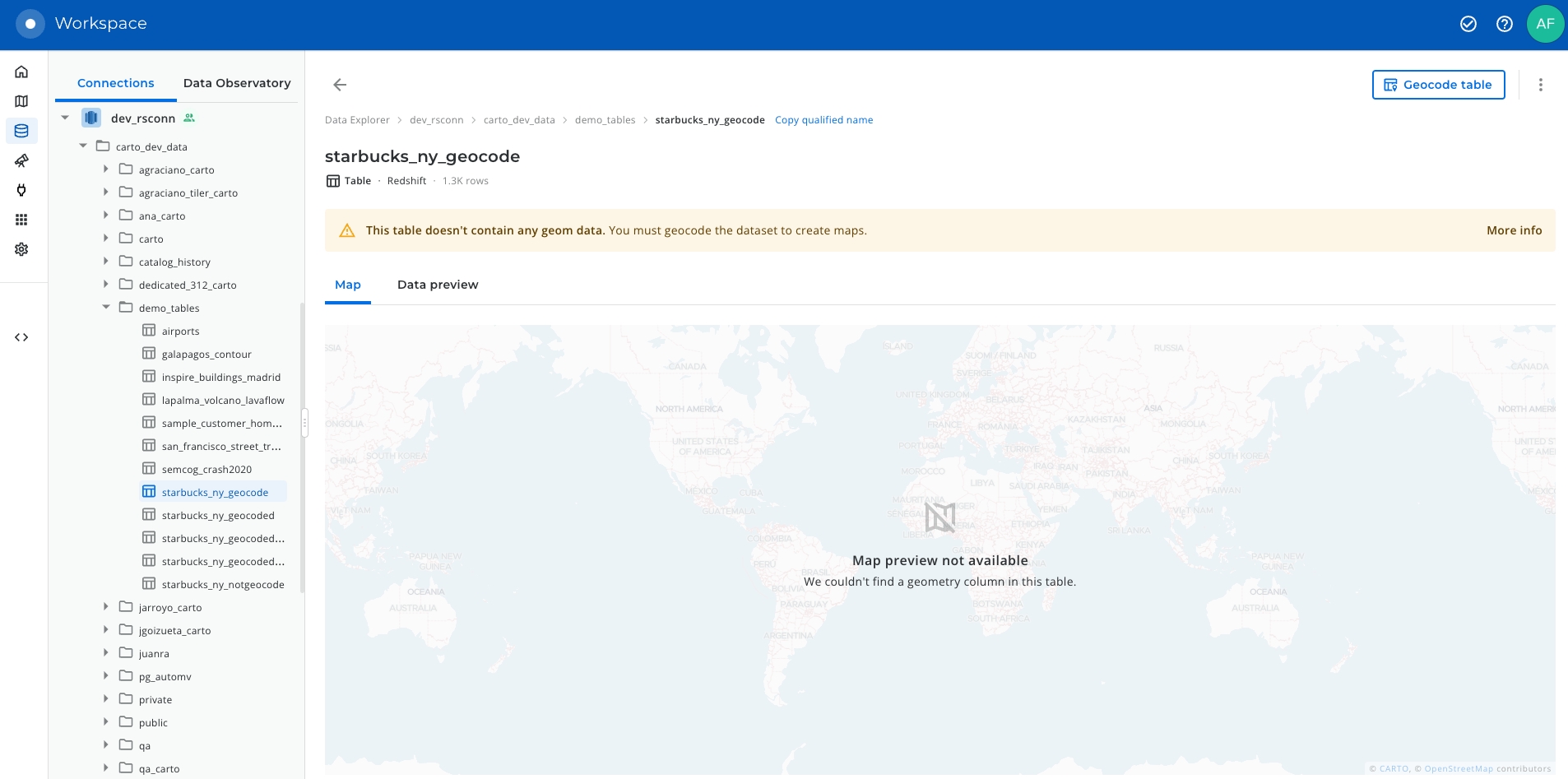 The Data Explorer offers you a graphical interface that you can use to geocode your data. Let’s use it here to reproduce the same use case that we have done from the Redshift console but from the CARTO Workspace.