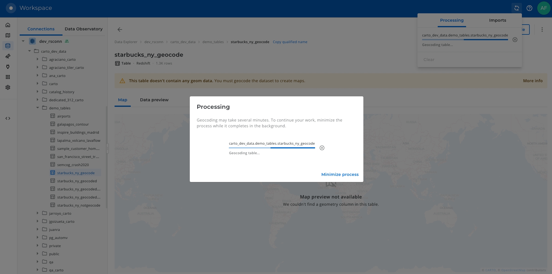 The geocoding process could take some minutes, remember that you may be geocoding a big amount of data and that the operation is calling an external geocoding service. You can minimize the process window and continue working with CARTO in the meantime and follow the progress of the geocoding process at any time you want.