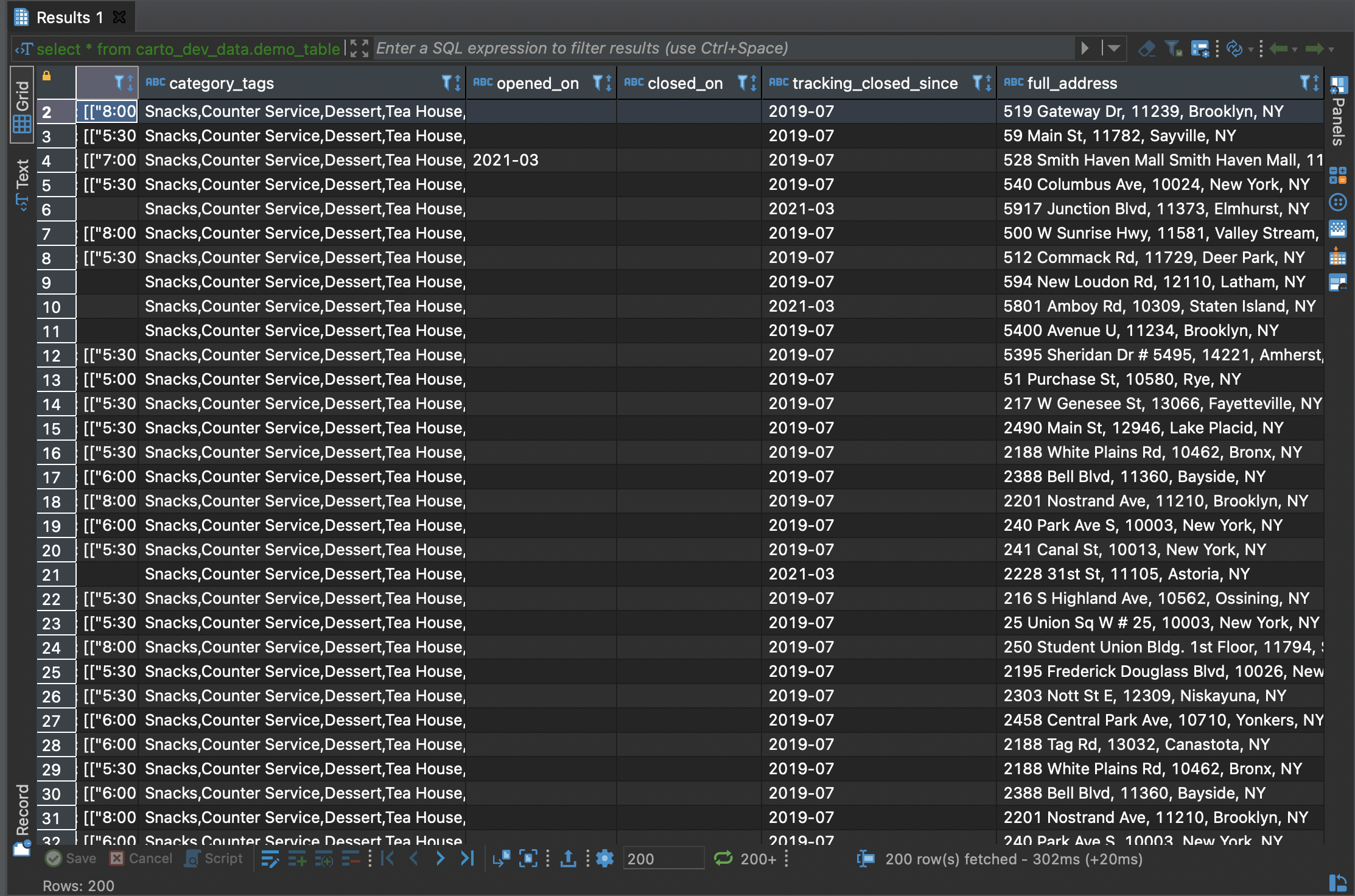 As a result of the query, we obtain the input table modified with a new column called “geom” with the geographic coordinates (latitude and longitude) and the “carto_geocode_metadata” column with additional information of the geocoding result in JSON format.