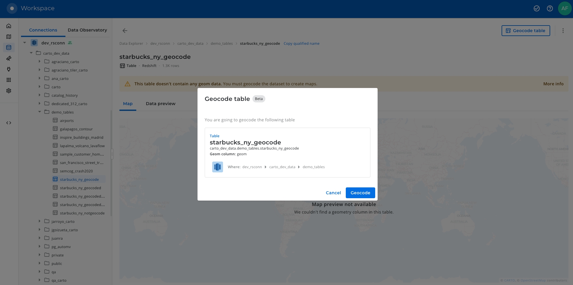 Geocoding from CARTO Workspace