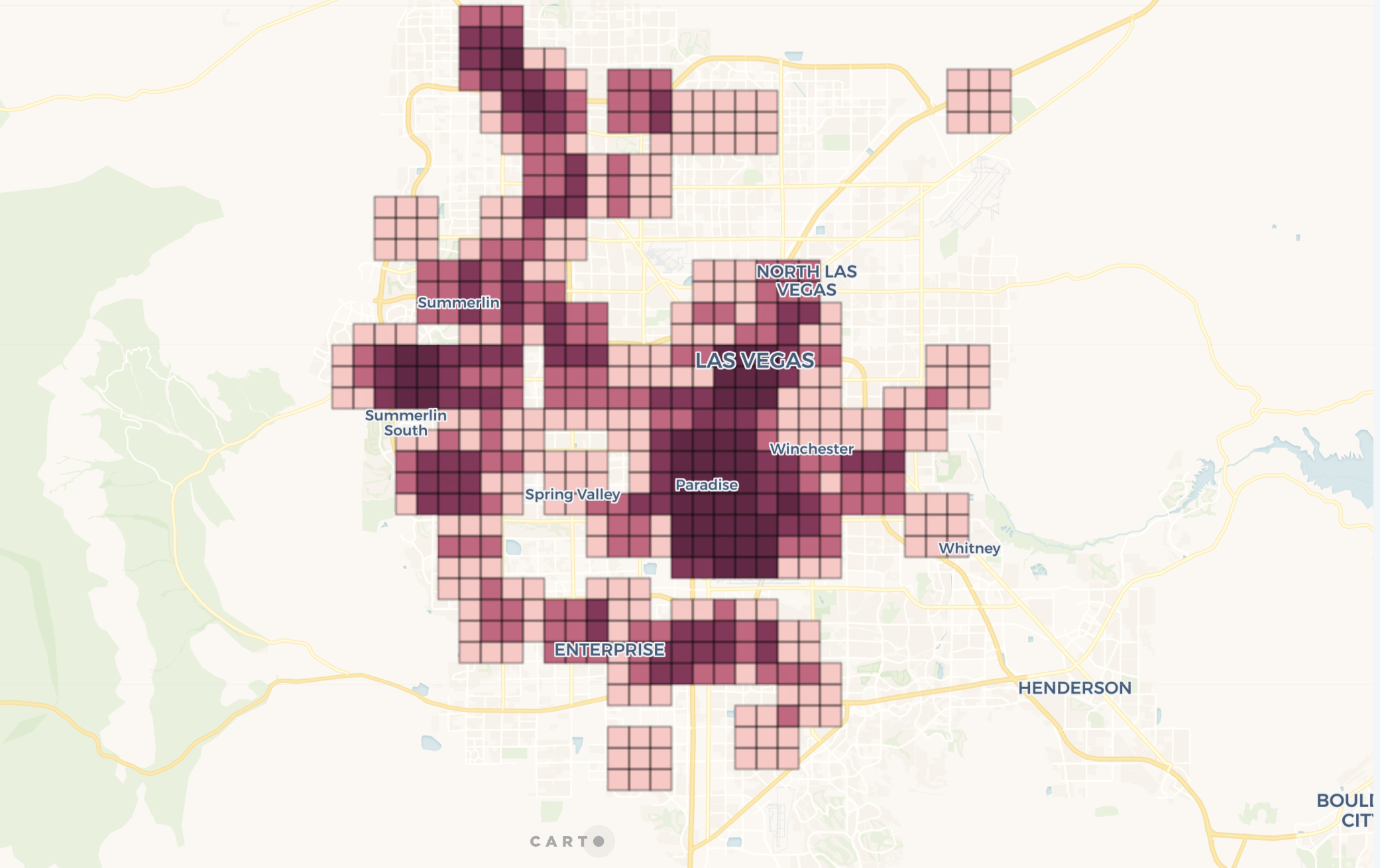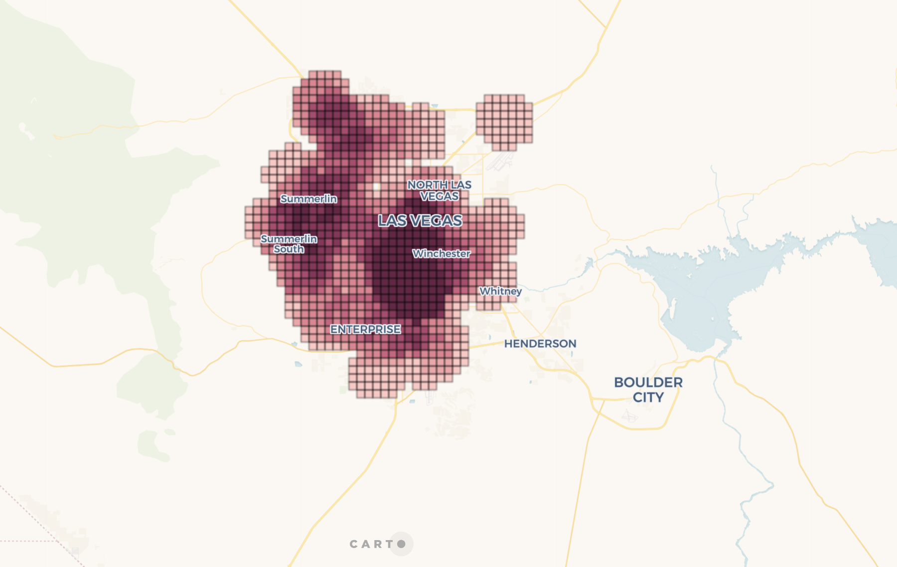 Next, we will analyze in finer detail the grid cells in Las Vegas to identify potential cannibalizations through to analysis of the surroundings of each store. We present the same analysis applying two different methods, which simply differ in the way the influence areas around each store are defined.