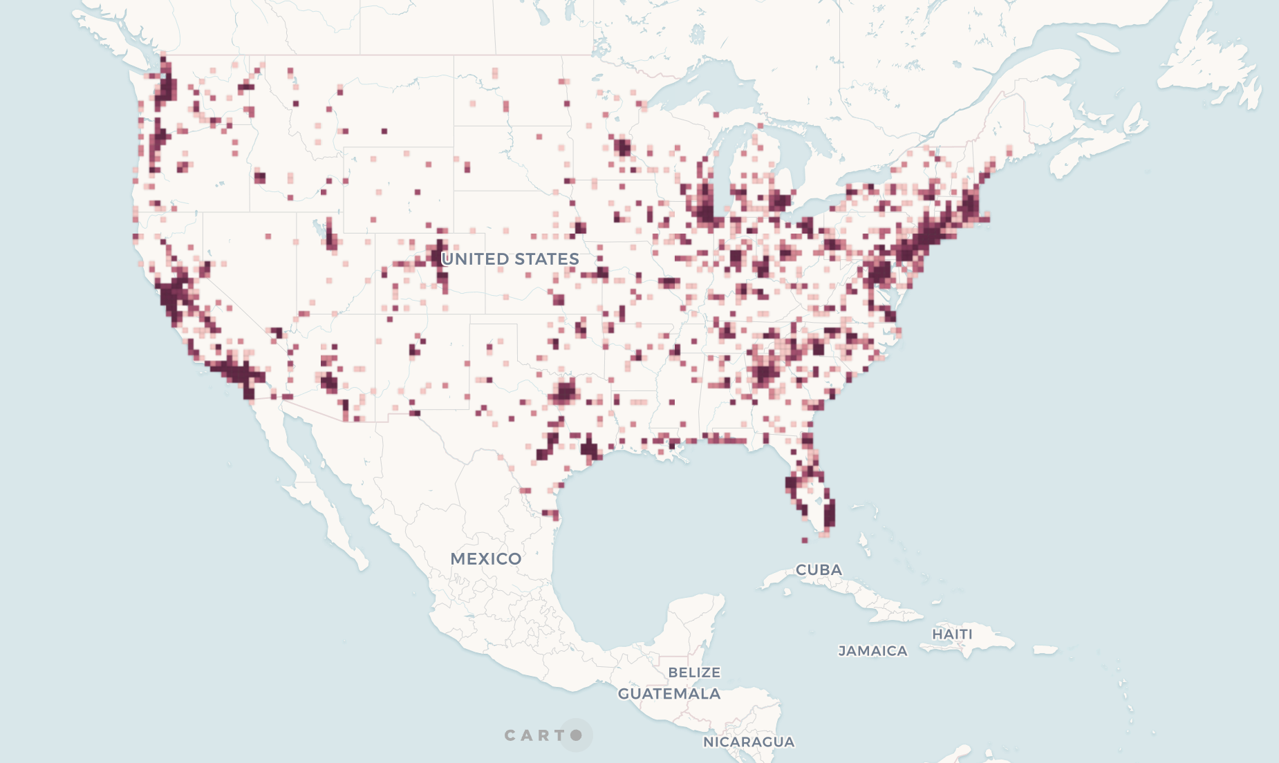 This query adds two new columns to our dataset: geom, representing the boundary of each of the Quadkey grid cells where there’s at least one Starbucks, and agg_total, containing the total number of locations that fall within each cell. Finally, we can visualize the result.