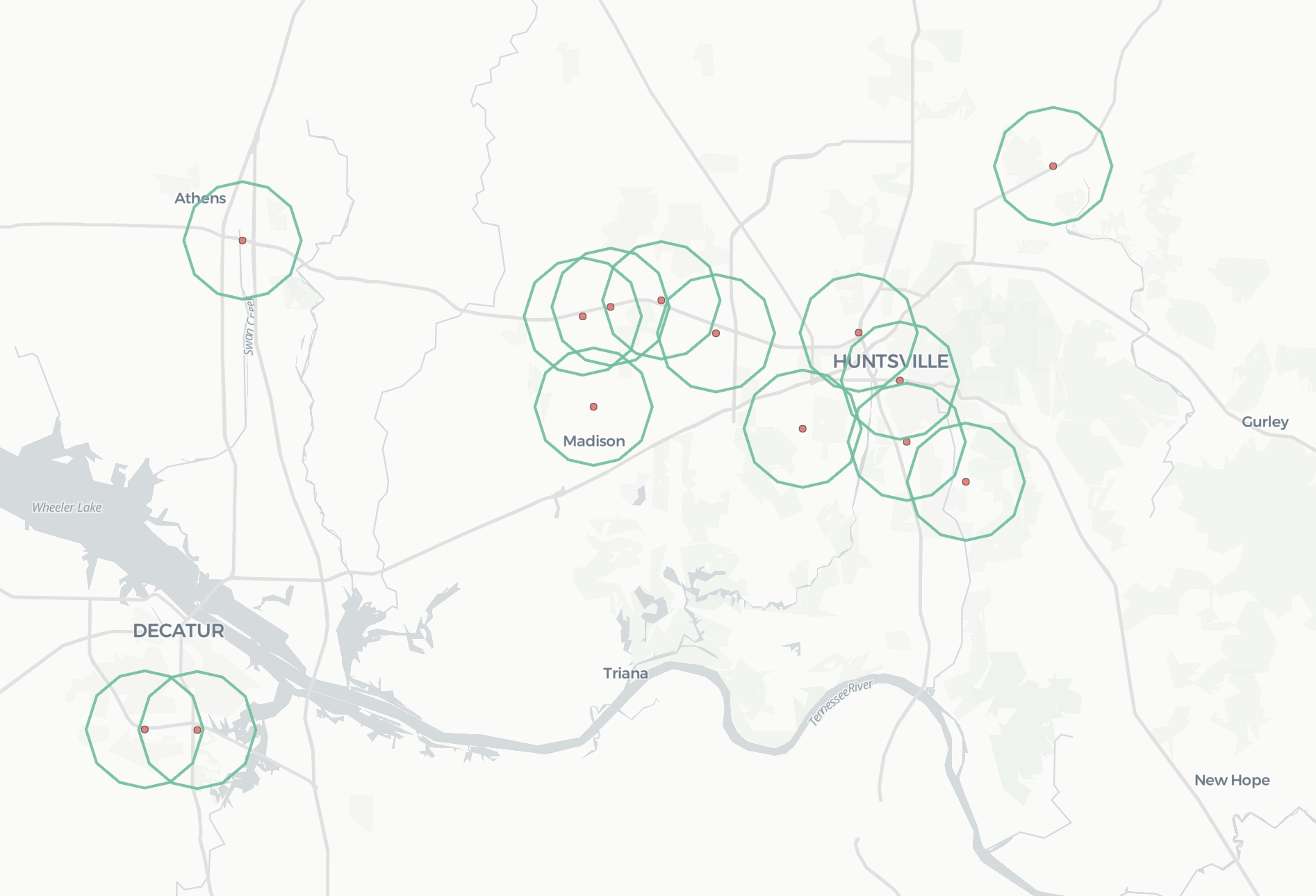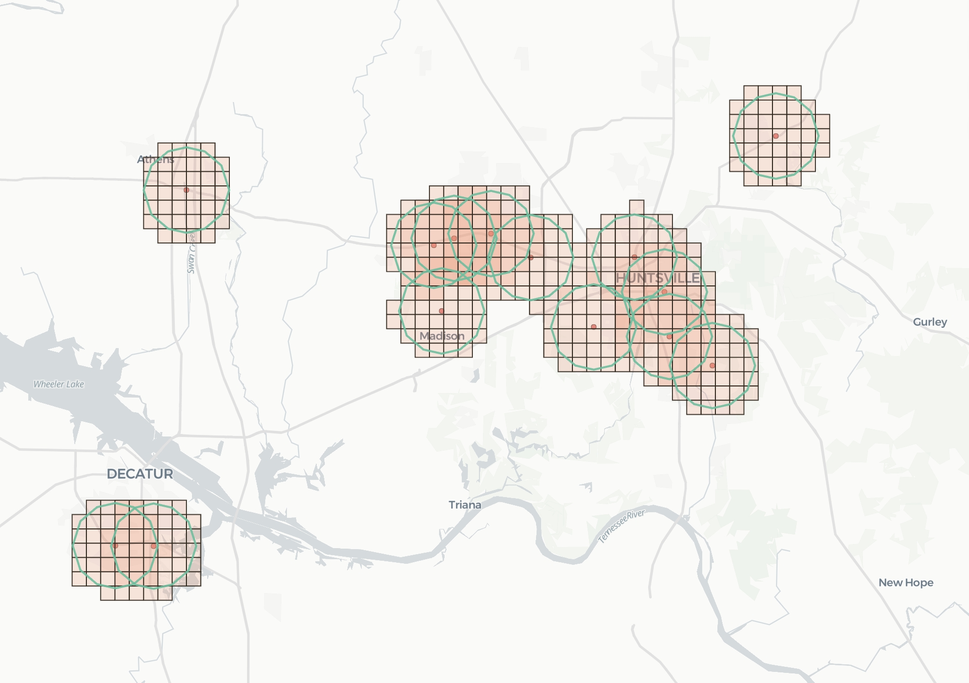 We can then deepen our analysis by computing the Quadkeys at resolution 15 that intersect with these buffers using the available polyfill function.