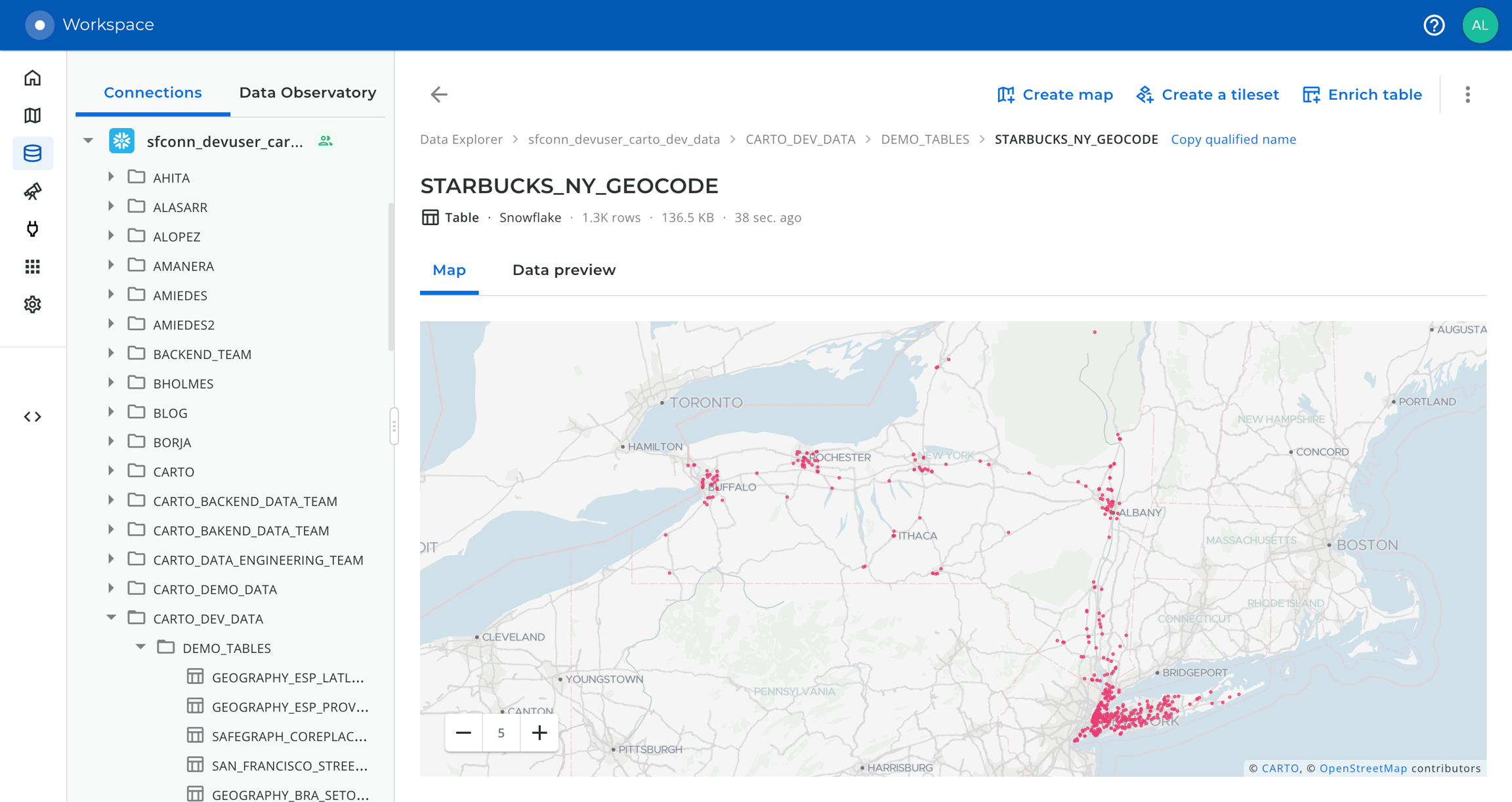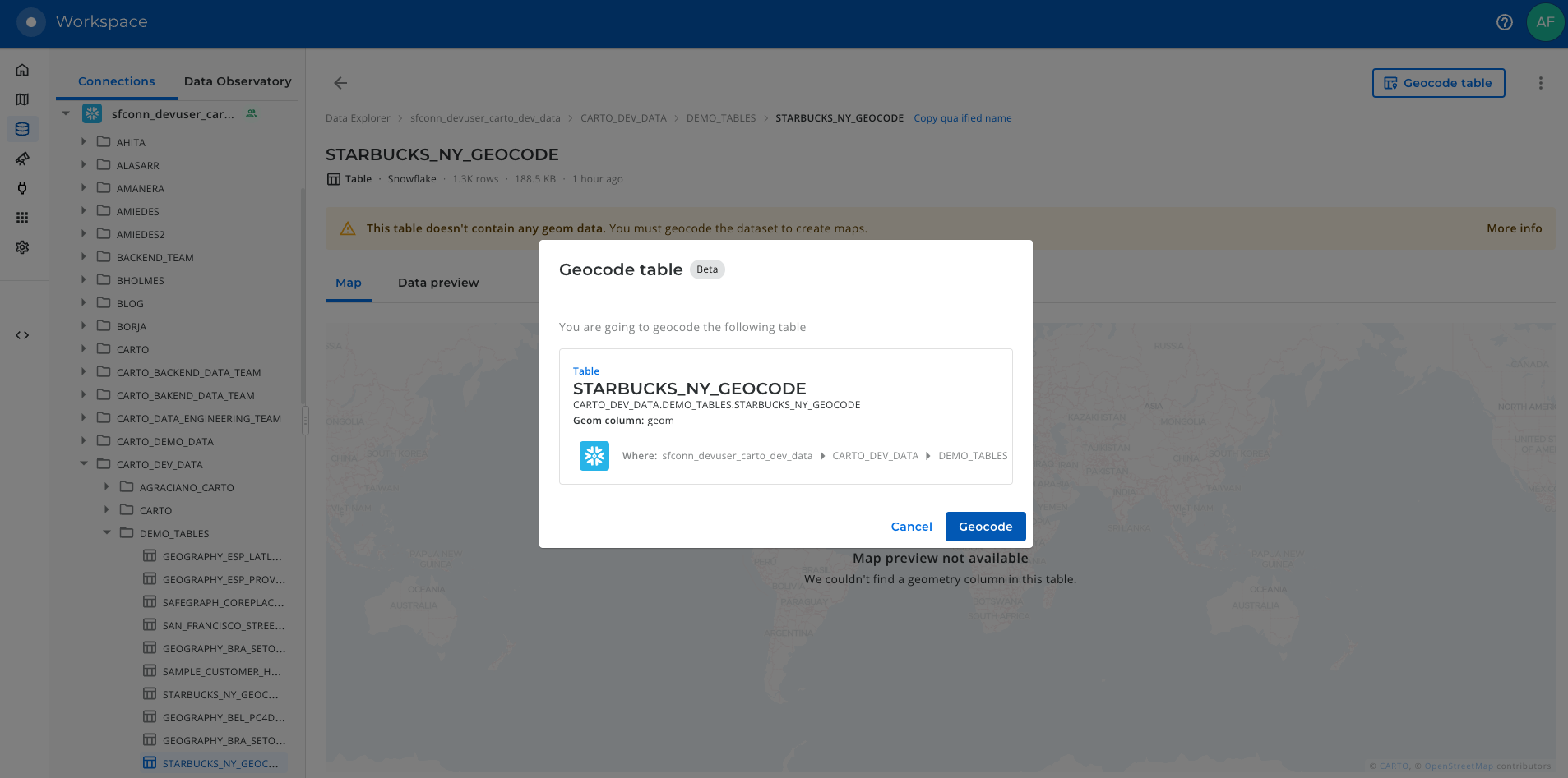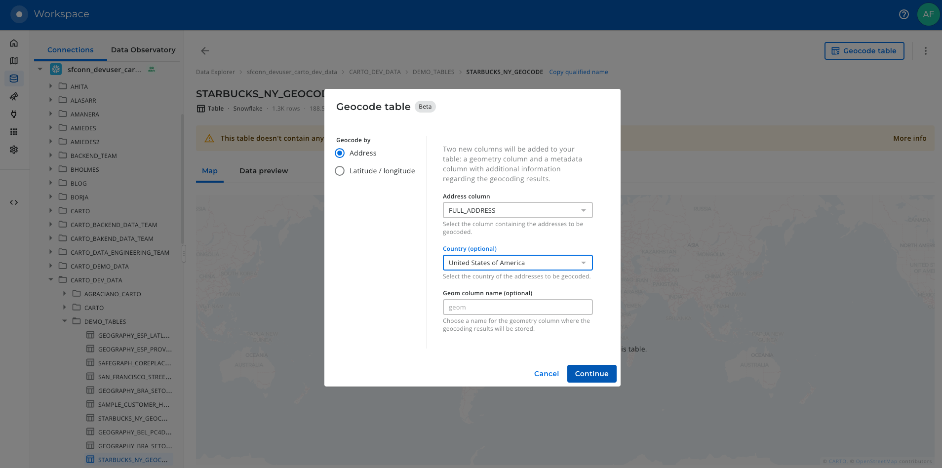 The Data Explorer offers you a graphical interface that you can use to geocode your data. Let’s use it here to reproduce the same use case that we have done from the Snowflake console but from the CARTO Workspace.
