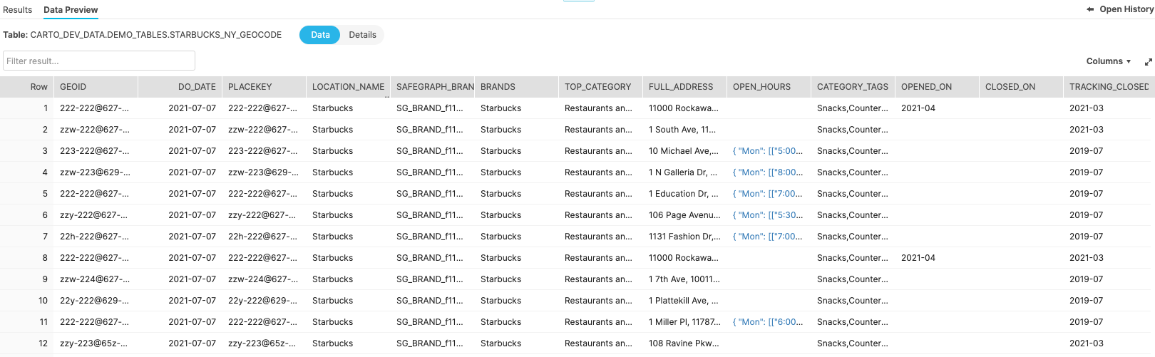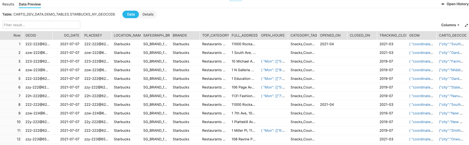 For this example we will use a table with the Starbucks addresses that can be found in the publicly available MYDB.MYSCHEMA.STARBUCKS_NY_GEOCODE . The table contains a column called “full_address” that we will use as input for the geocoding process.
