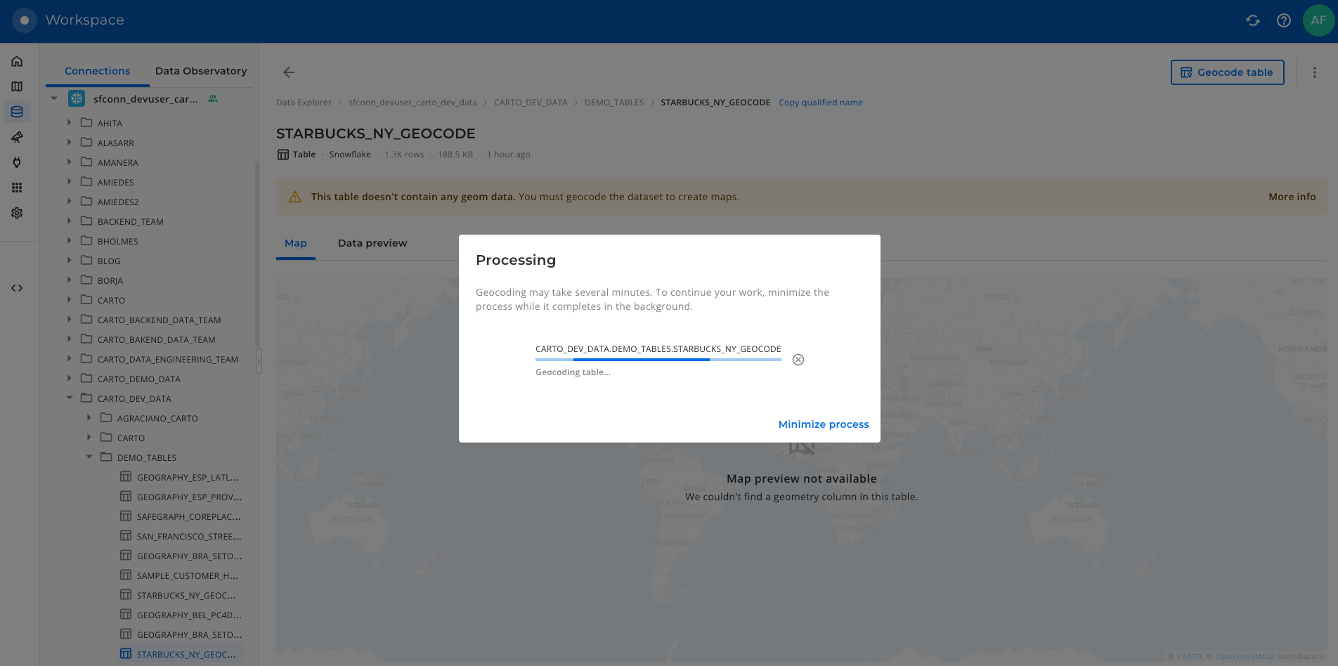 The geocoding process could take some minutes, remember that you may be geocoding a big amount of data and that the operation is calling an external geocoding service. You can minimize the process window and continue working with CARTO in the meantime and follow the progress of the geocoding process at any time you want.