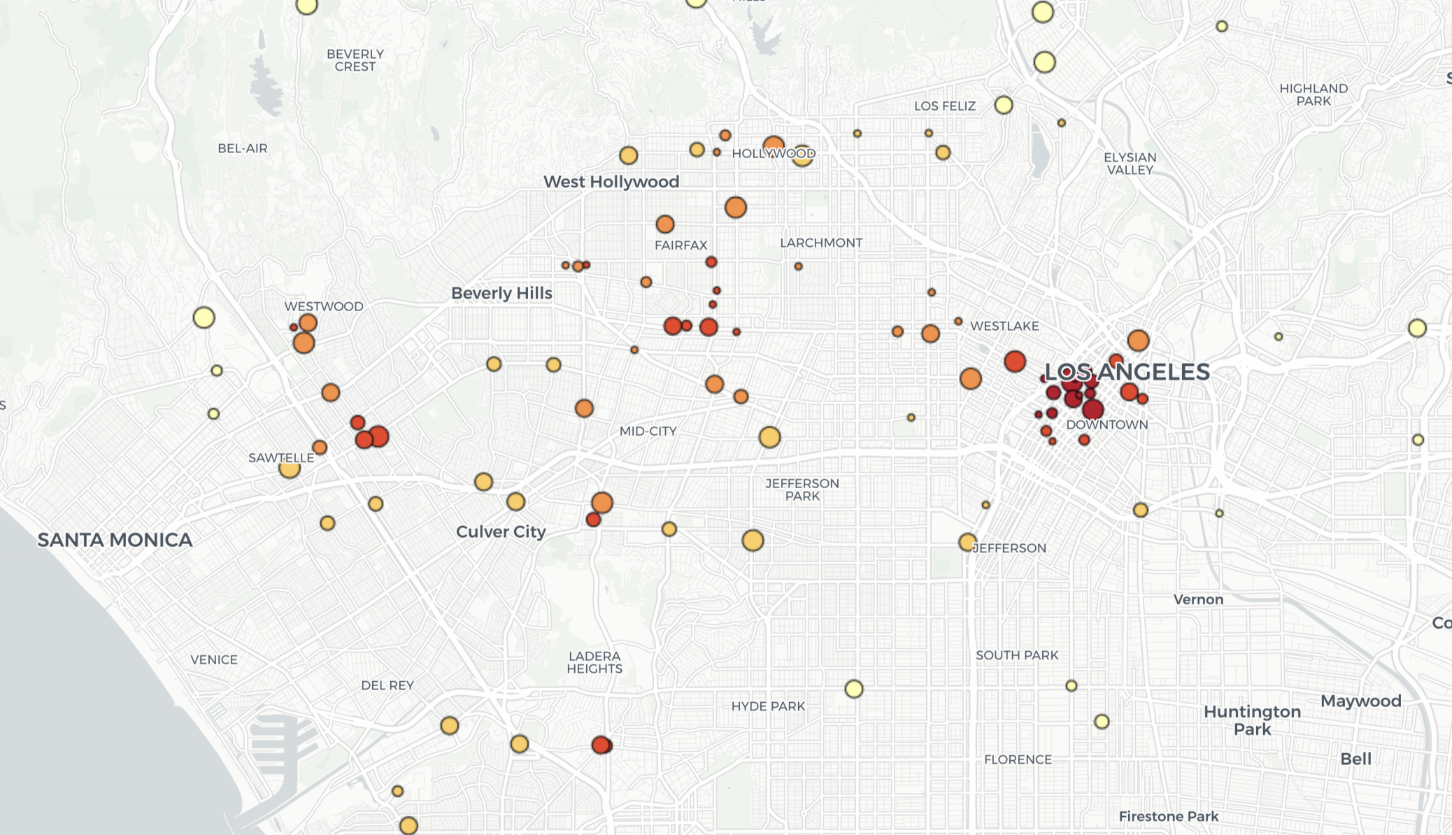 In this example we are going to showcase how to use the Minkowski distance to evaluate cannibalization across Starbucks stores in Los Ángeles, assuming that the ratio of cannibalization depends on the nearby store sizes and the distance to them. As we do not have real data concerning of the store, for the sake of simplicity we are going to use a randomly generated value: starbucks_size.