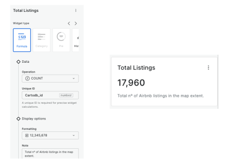 In the Interactions tab (to the right of Widgets), add an interaction to H3 Airbnb aggregation so users can review attributes while navigating the map. Switch from Click to Hover and choose the style Light. Select the attributes population_joined_joined (sum), urbanity_joined_joined (mode) and airbnb_count_joined. Click on the variable options (#) to choose a more appropriate format and more readable field names. Your map should now be looking a bit like the below: