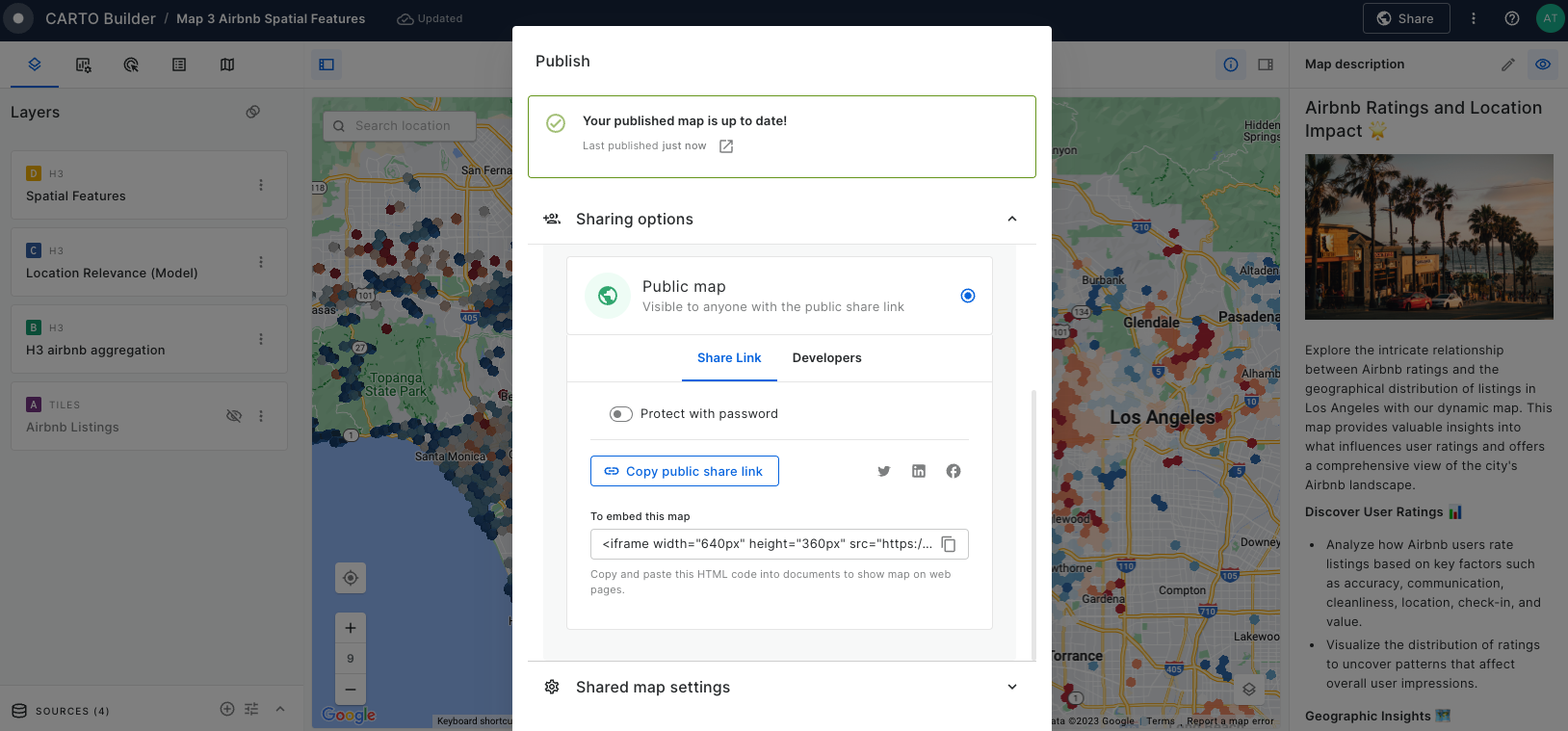 So far we have seen how the Airbnb listings locations and its main variables are distributed across the city of Los Angeles. Next, we will enrich our visualization by adding CARTO Spatial Features H3 at resolution 8 dataset from CARTO Data Observatory.