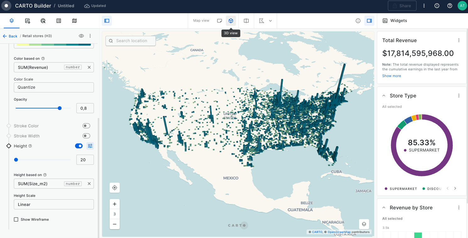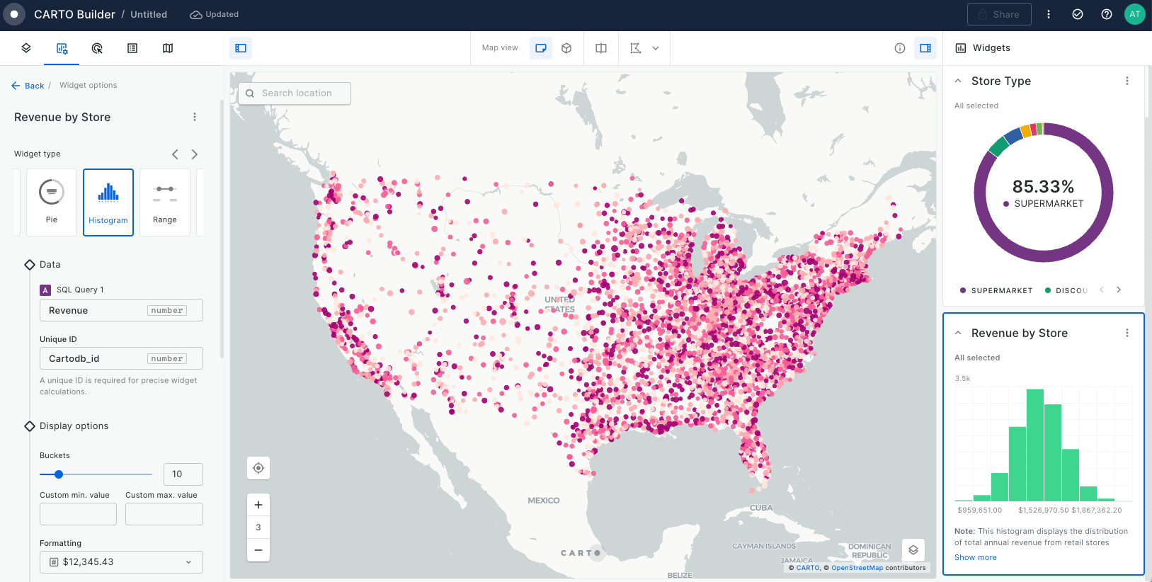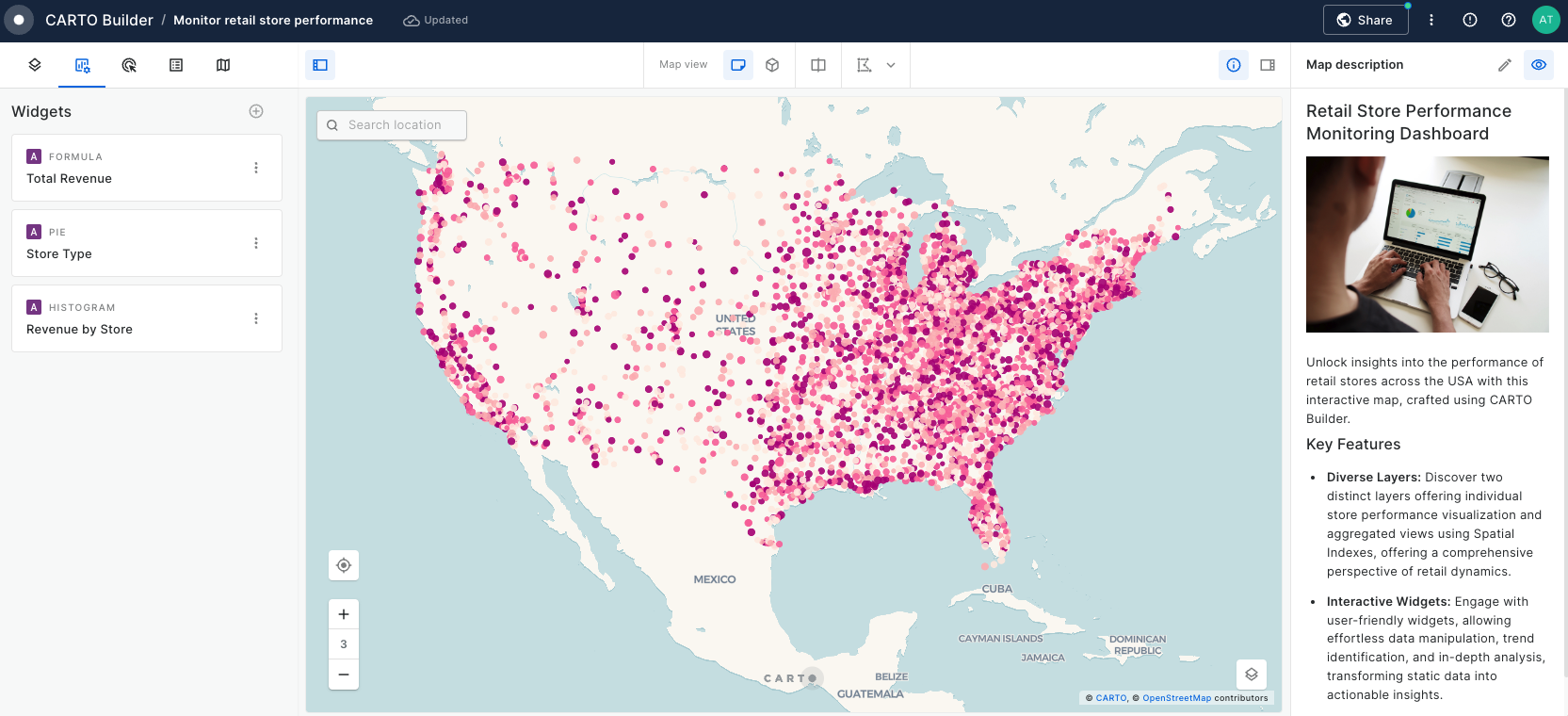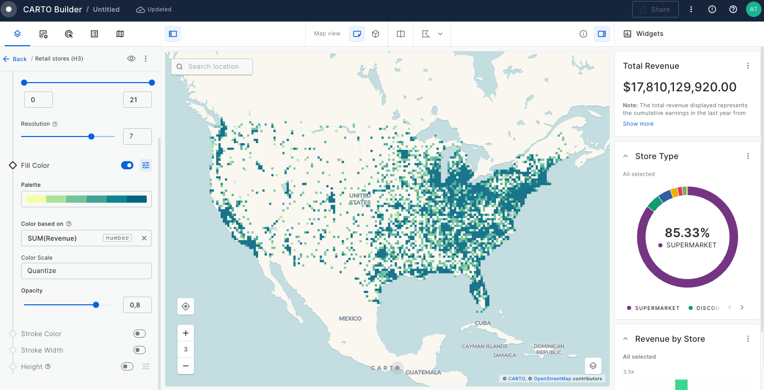 In this tutorial, you’ll learn how to use CARTO Builder to create an interactive dashboard for visualizing and analyzing retail store performance across the USA. We’ll create two types of layers; one displaying stores in their original geometry using bubbles and another using point geometry aggregated to Spatial Indexes, all easily managed through the CARTO UI.