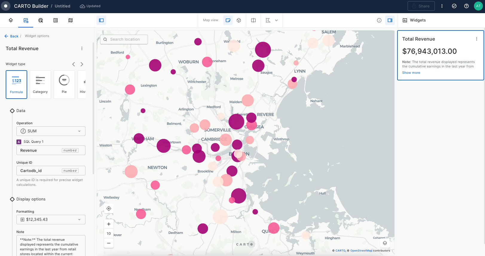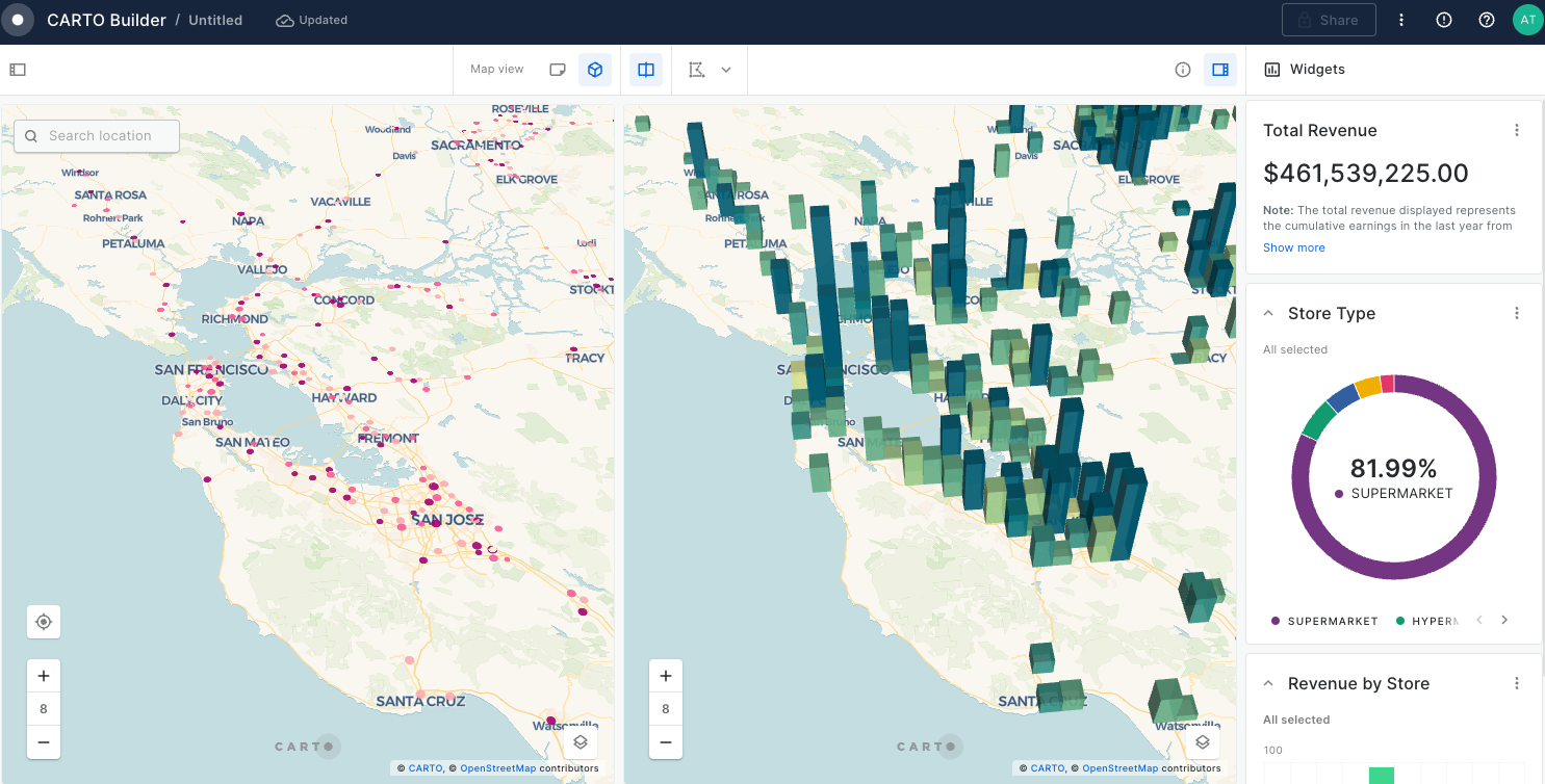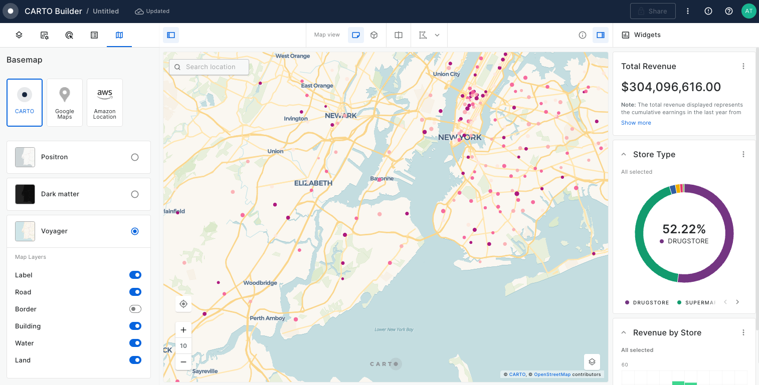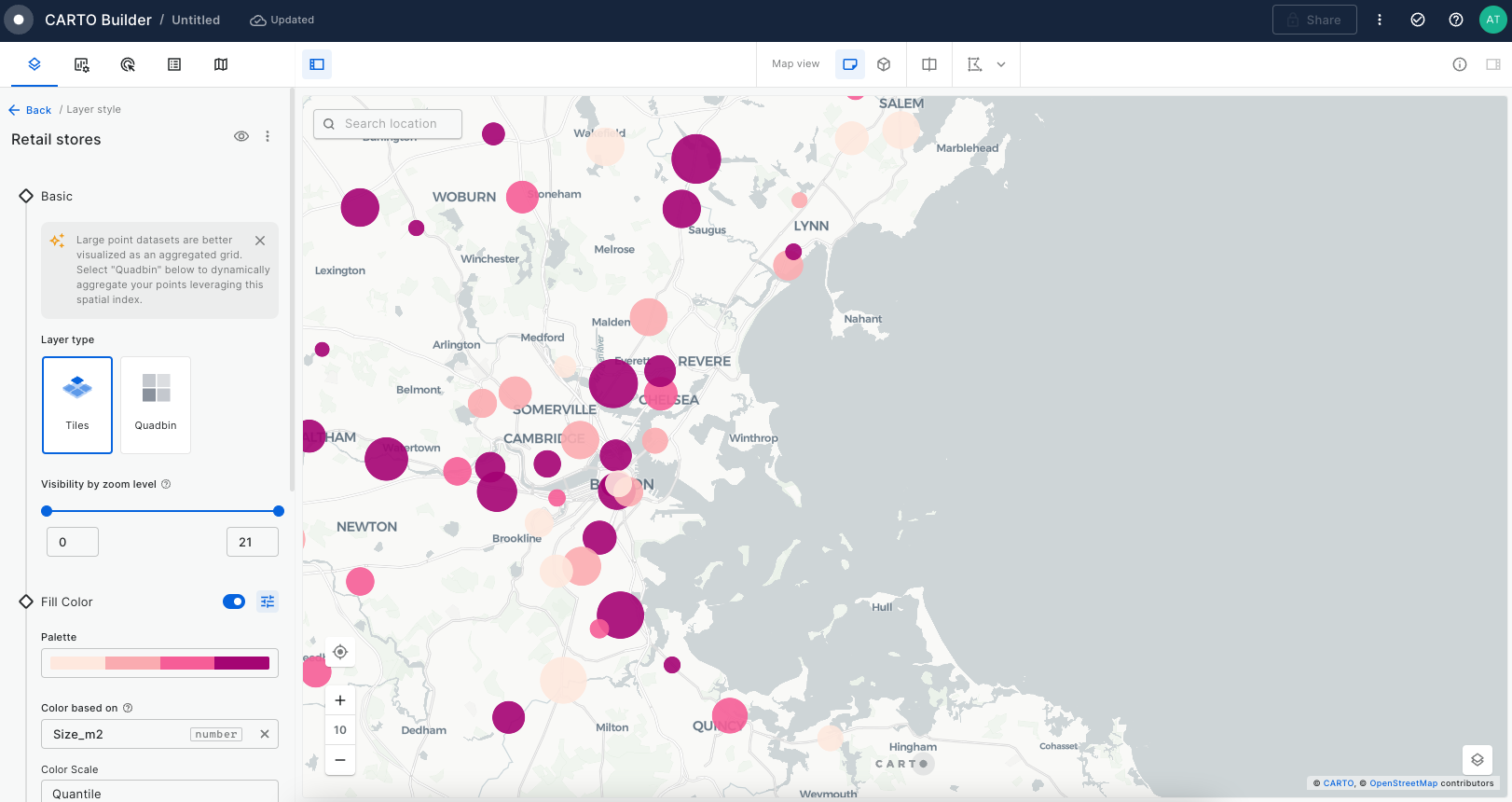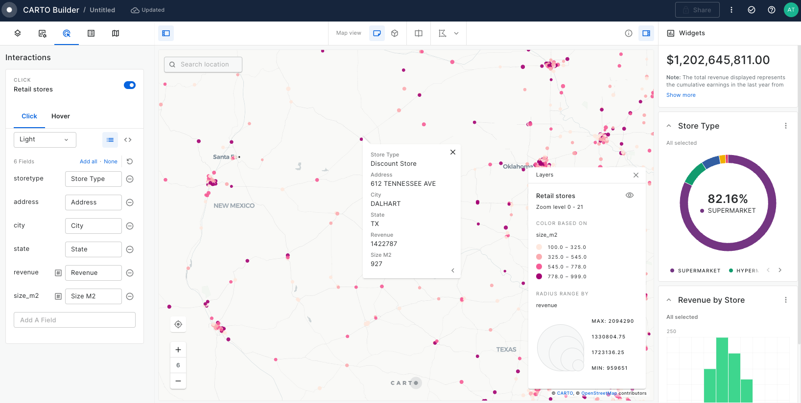 In this tutorial, you’ll learn how to use CARTO Builder to create an interactive dashboard for visualizing and analyzing retail store performance across the USA. We’ll create two types of layers; one displaying stores in their original geometry using bubbles and another using point geometry aggregated to Spatial Indexes, all easily managed through the CARTO UI.