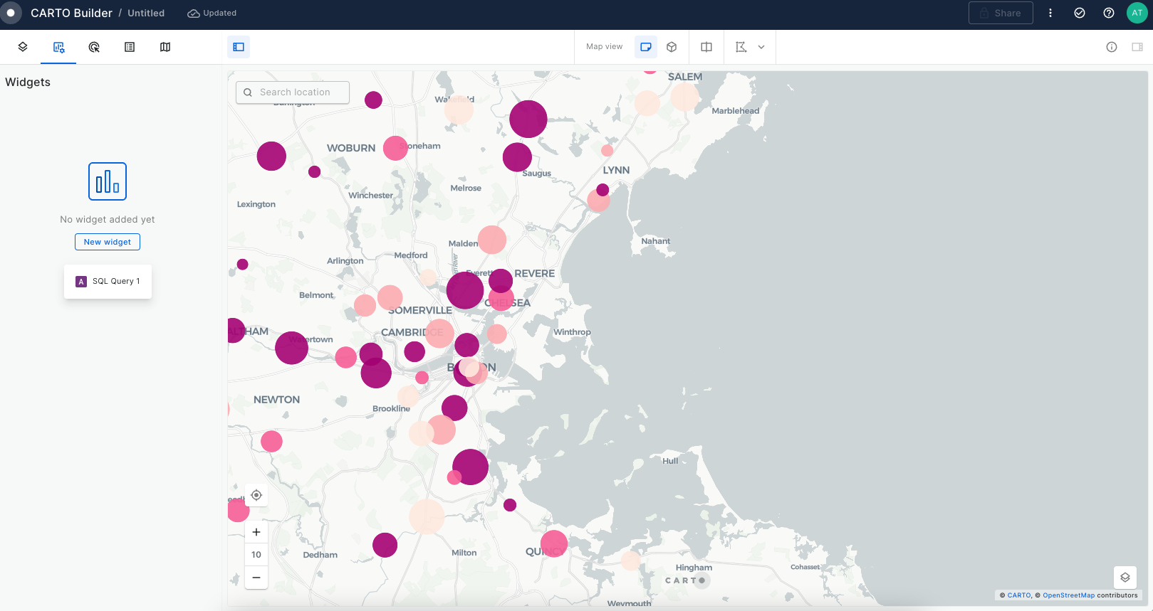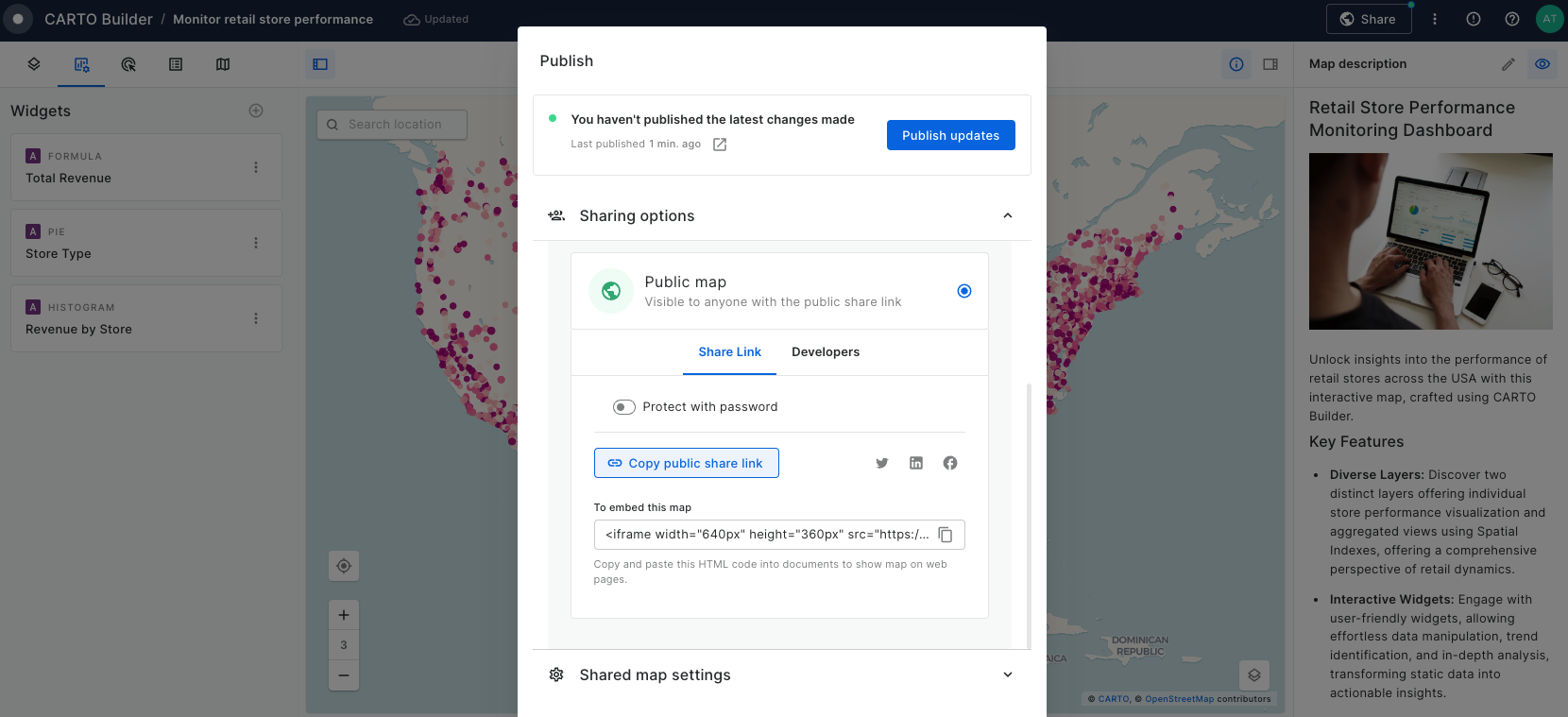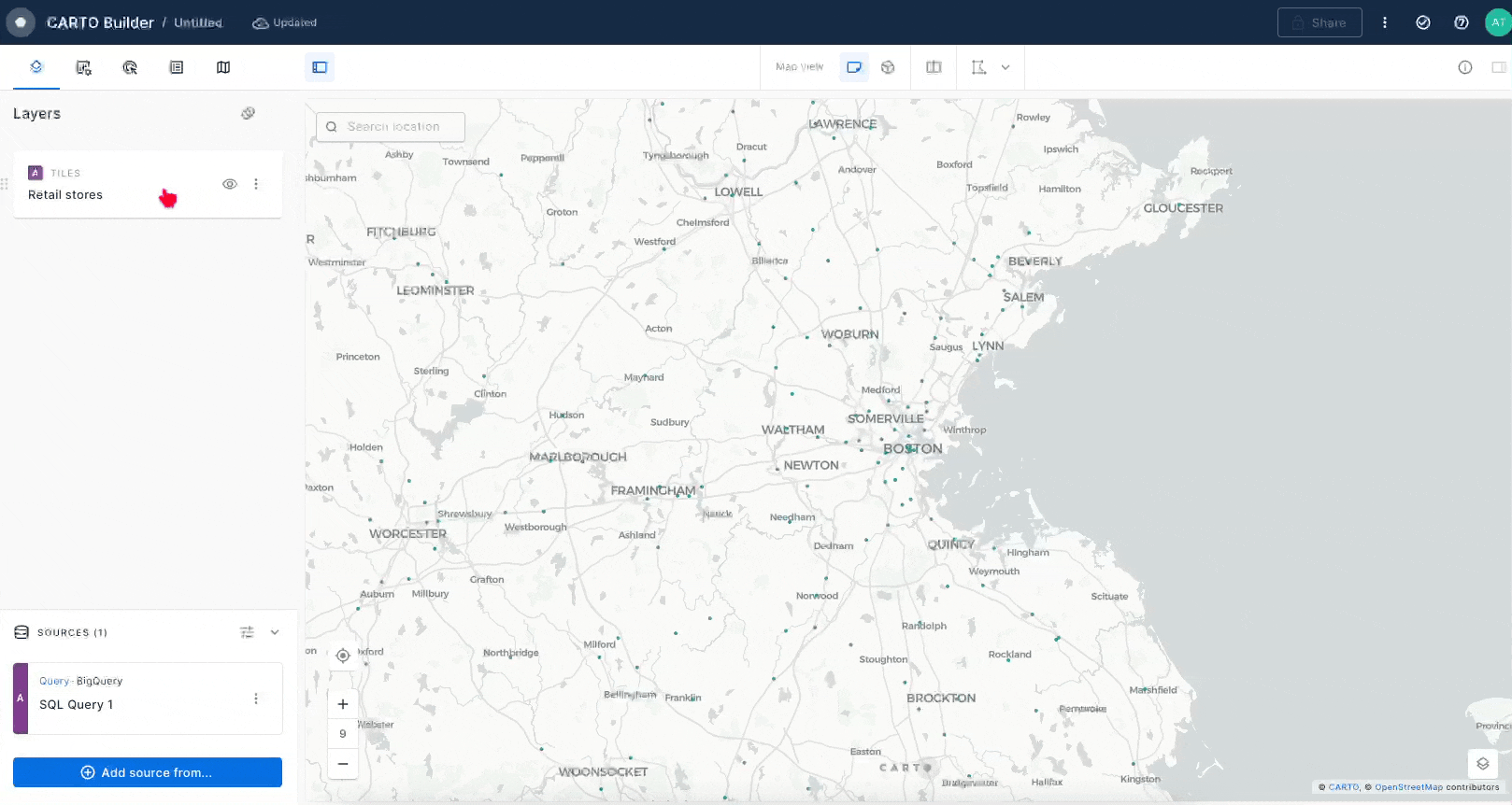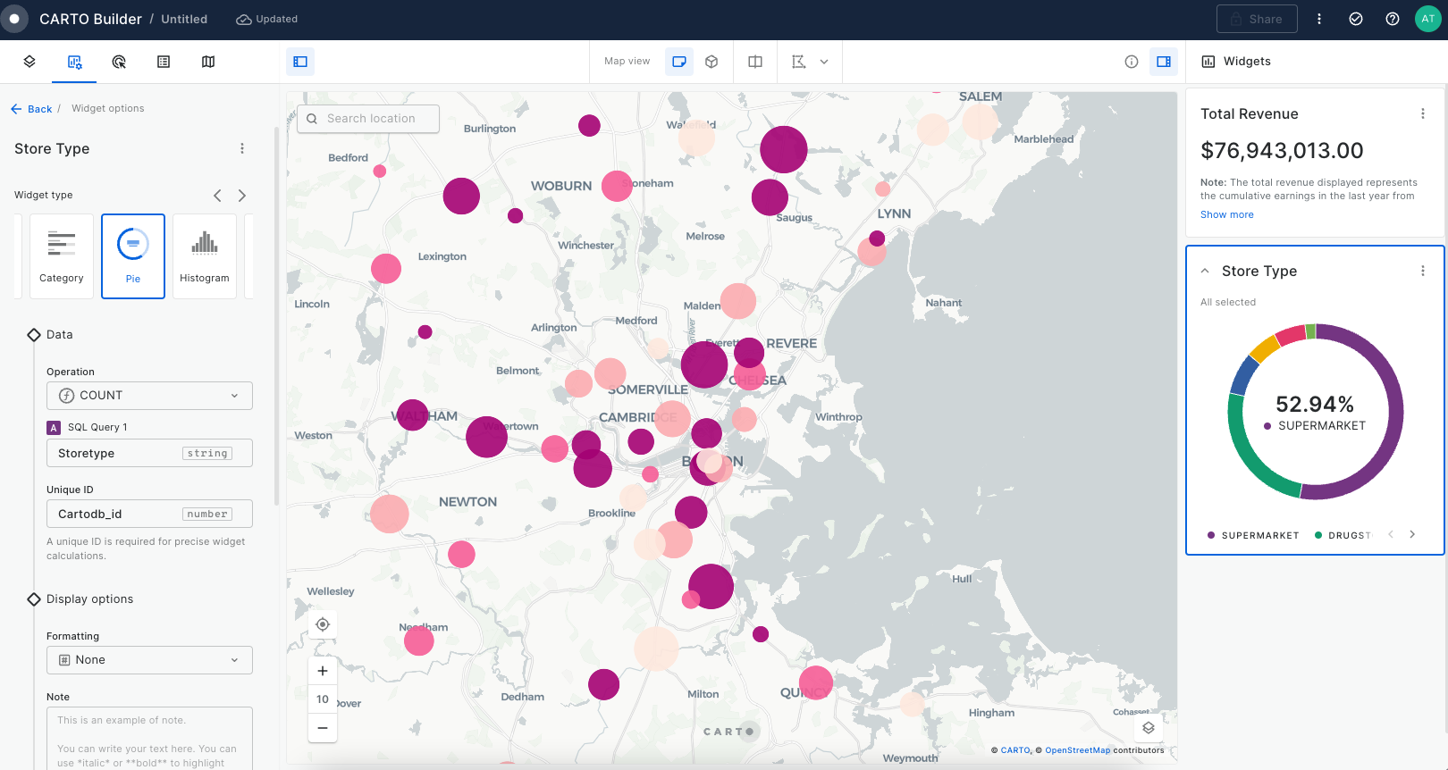 In this tutorial, you’ll learn how to use CARTO Builder to create an interactive dashboard for visualizing and analyzing retail store performance across the USA. We’ll create two types of layers; one displaying stores in their original geometry using bubbles and another using point geometry aggregated to Spatial Indexes, all easily managed through the CARTO UI.
