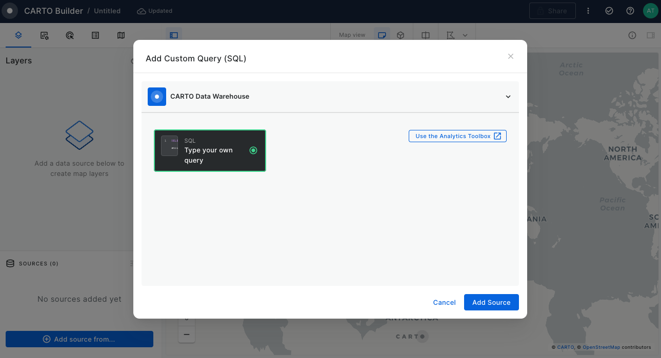 Now, we will upload the same data source using SQL Query type and this time we will dynamically aggregate it to Quadbin Spatial Indexes using the UI. To do so, run the following query: