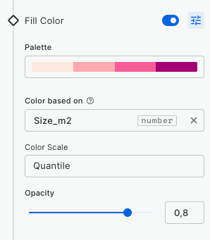 in the Fill Color section and apply “Color based on" using Size_m2column. Pick a gradient palette (versus one for a categorical variable), and set the gradient steps to 4.