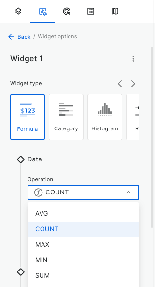 Then, select a widget type from the menu: Formula, Category, Histogram, Range, Time Series or Table.