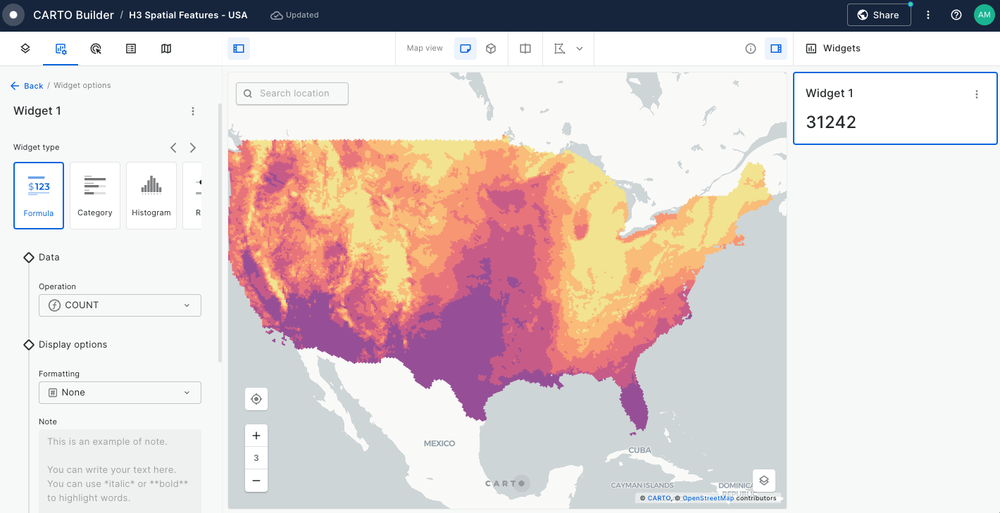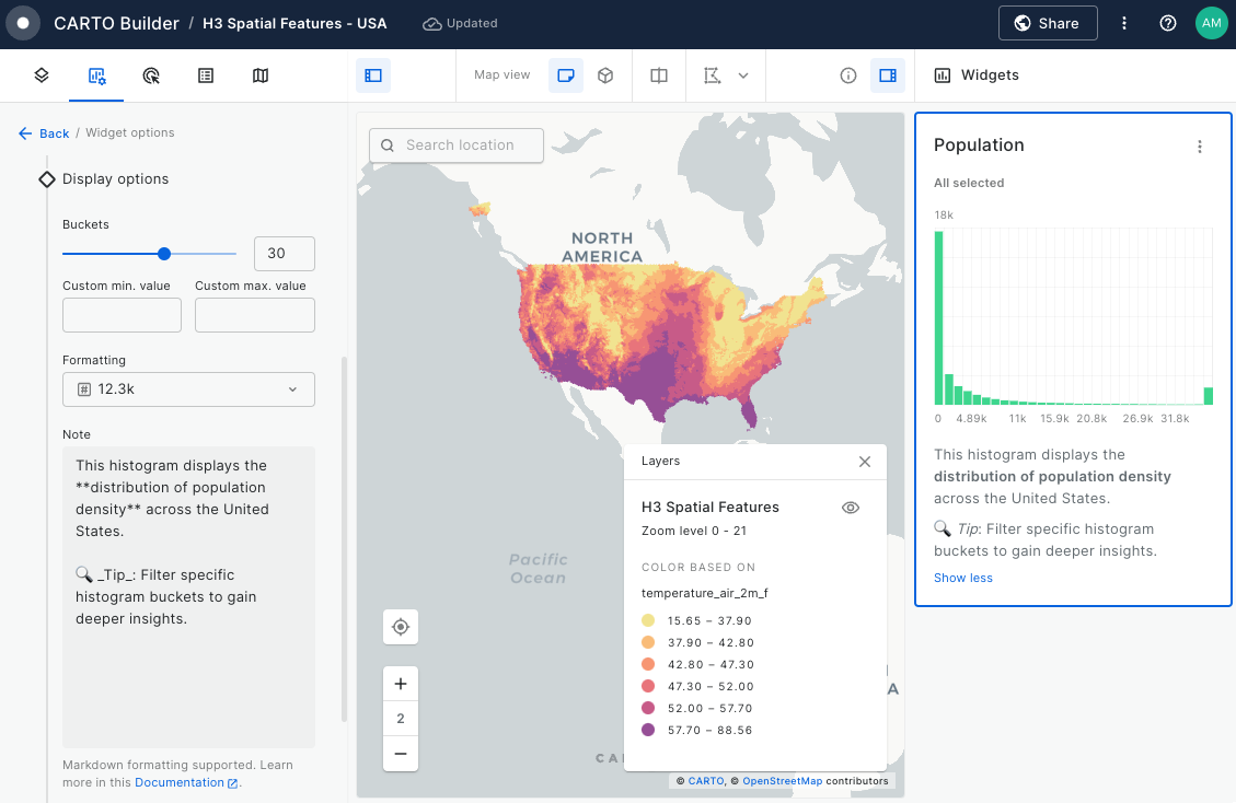 Builder enhances data interaction and analysis through two key features: Widgets and SQL Parameters. Widgets, linked to individual data sources, provide insights from map-rendered data and offer data filtering capabilities. This functionality not only showcases important information but also enhances user interactivity, allowing for deeper exploration into specific features.