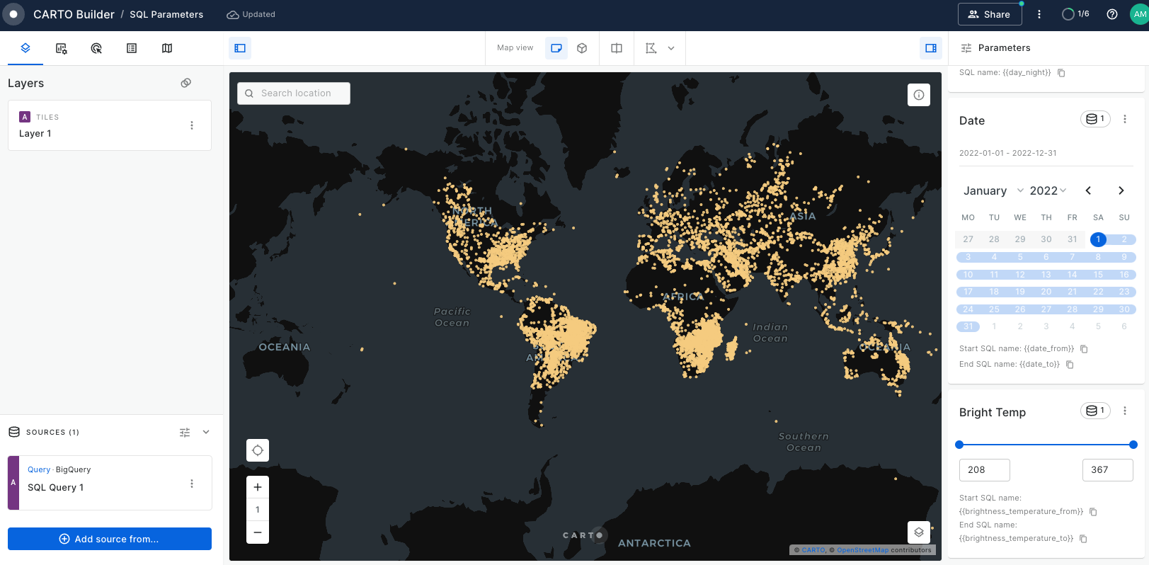 Once we have the data rendered in the map, we'll add a text parameter that helps us select between fires that happened during the day or the night.