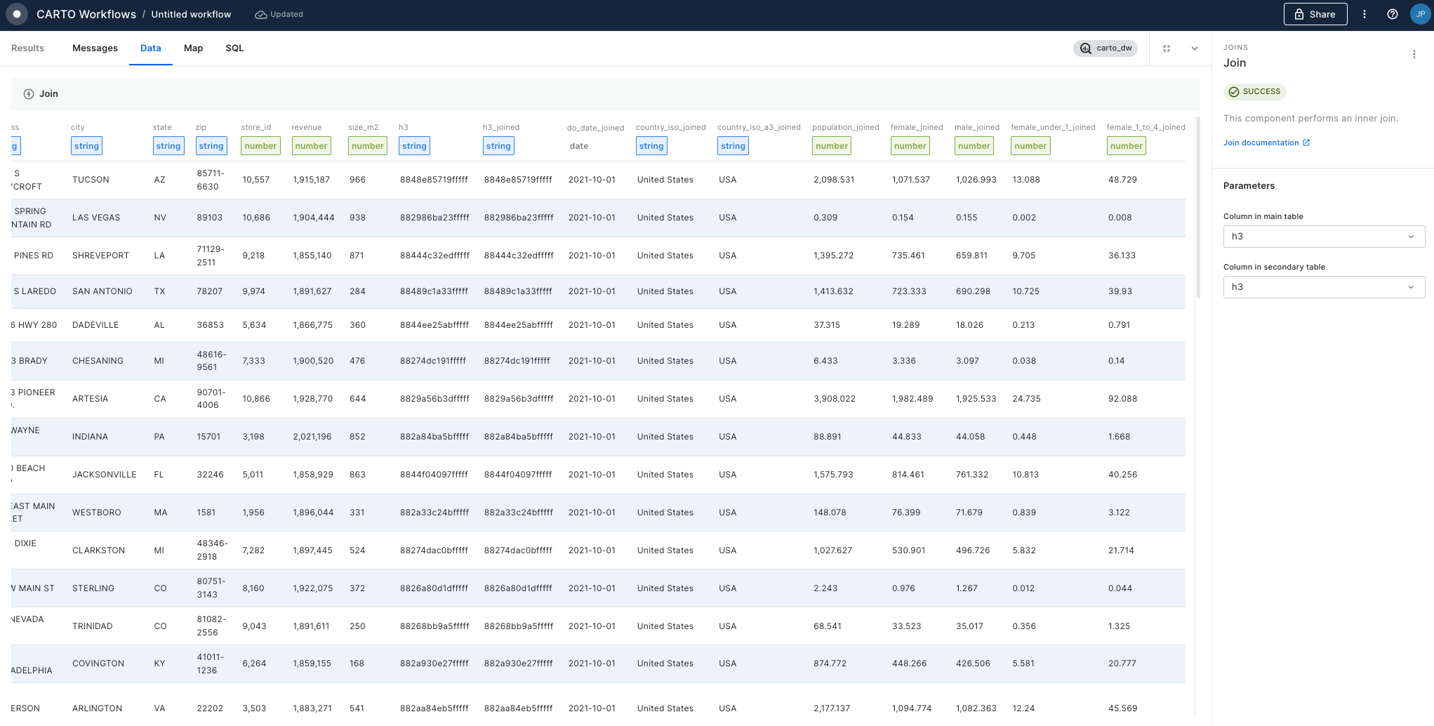 Check in the results tab that now you have joined data coming from the retail_stores table with data from CARTO's spatial features dataset.