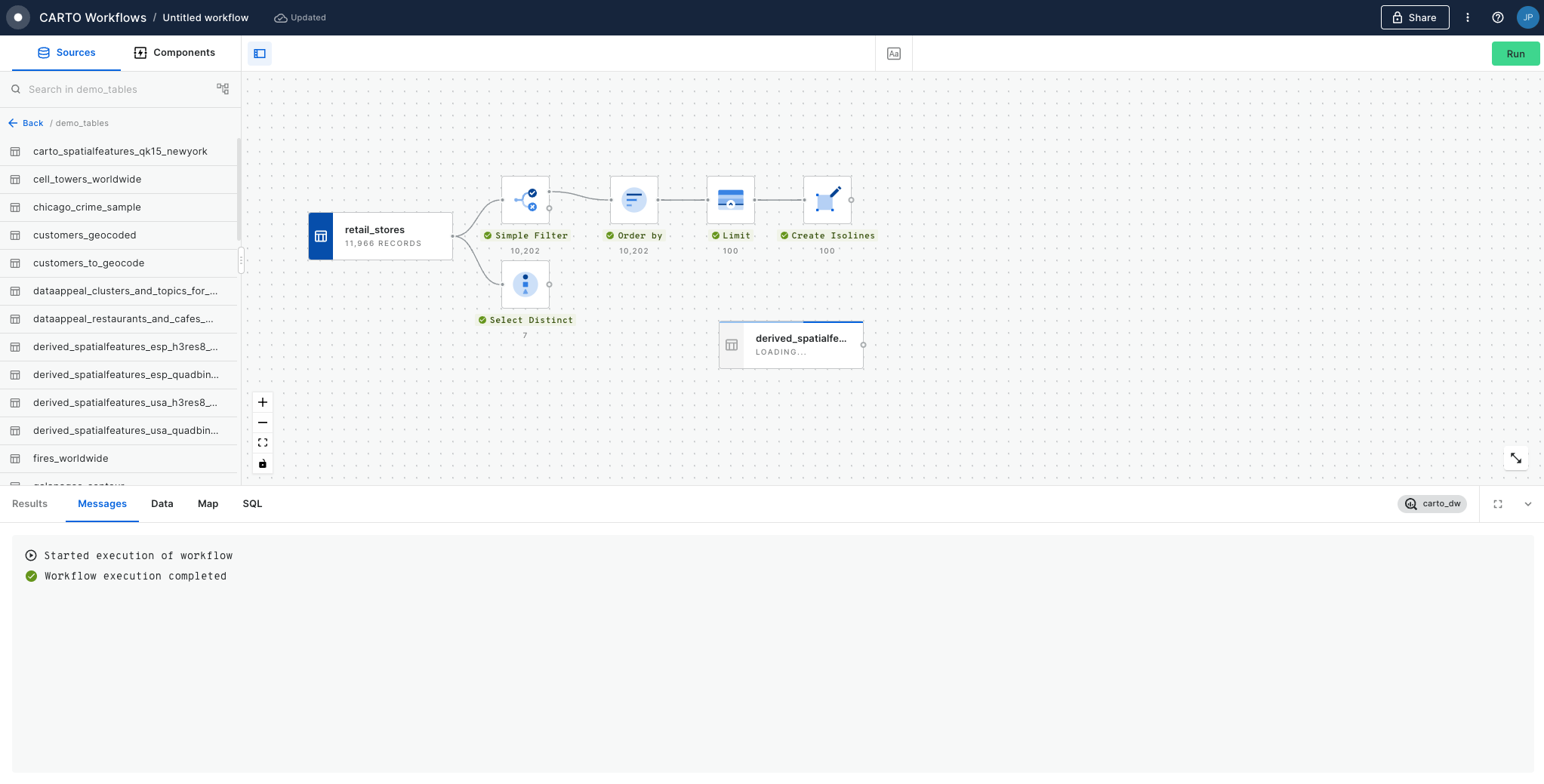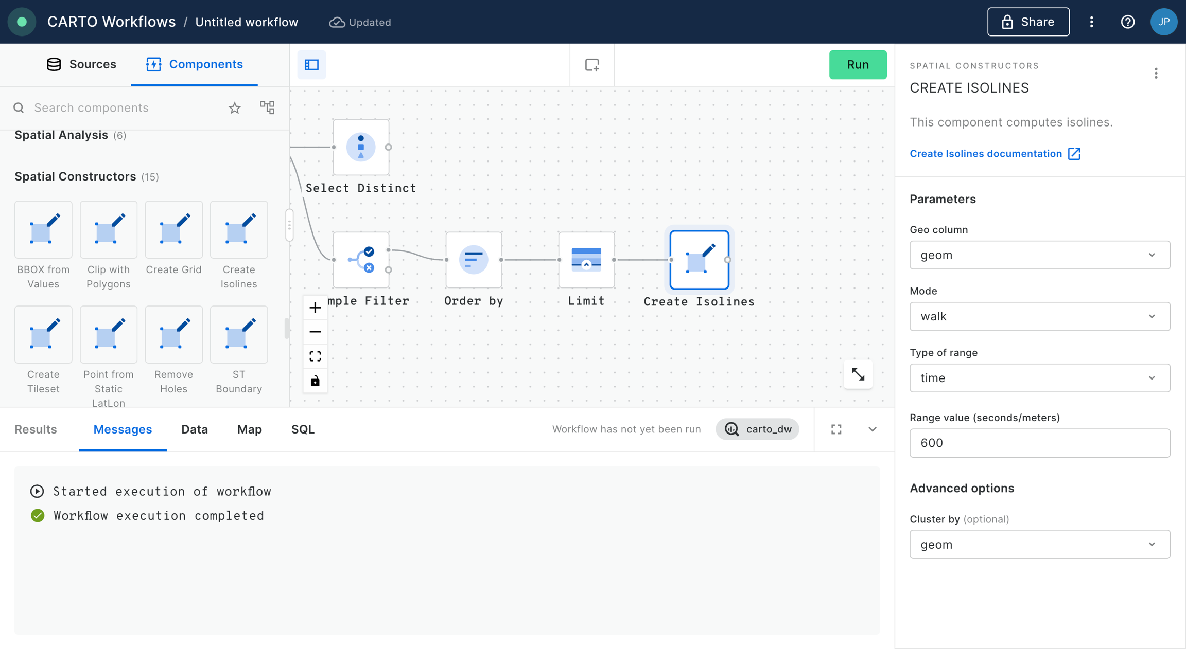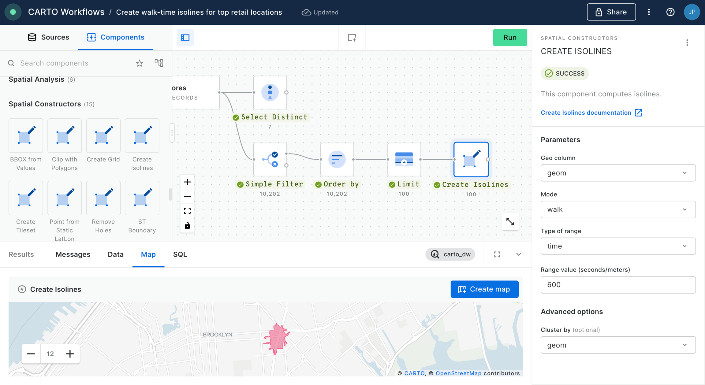 Click run to create 10-minute drive-time isolines. Note this is quite an intensive process compared to many other functions in Workflows (it's calling to an external location data services provider), and so may take a little longer to run.