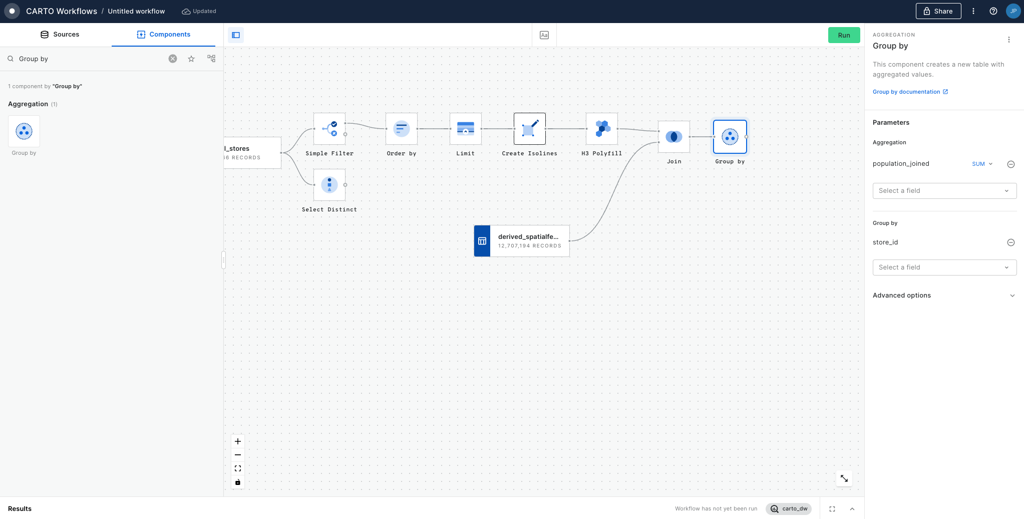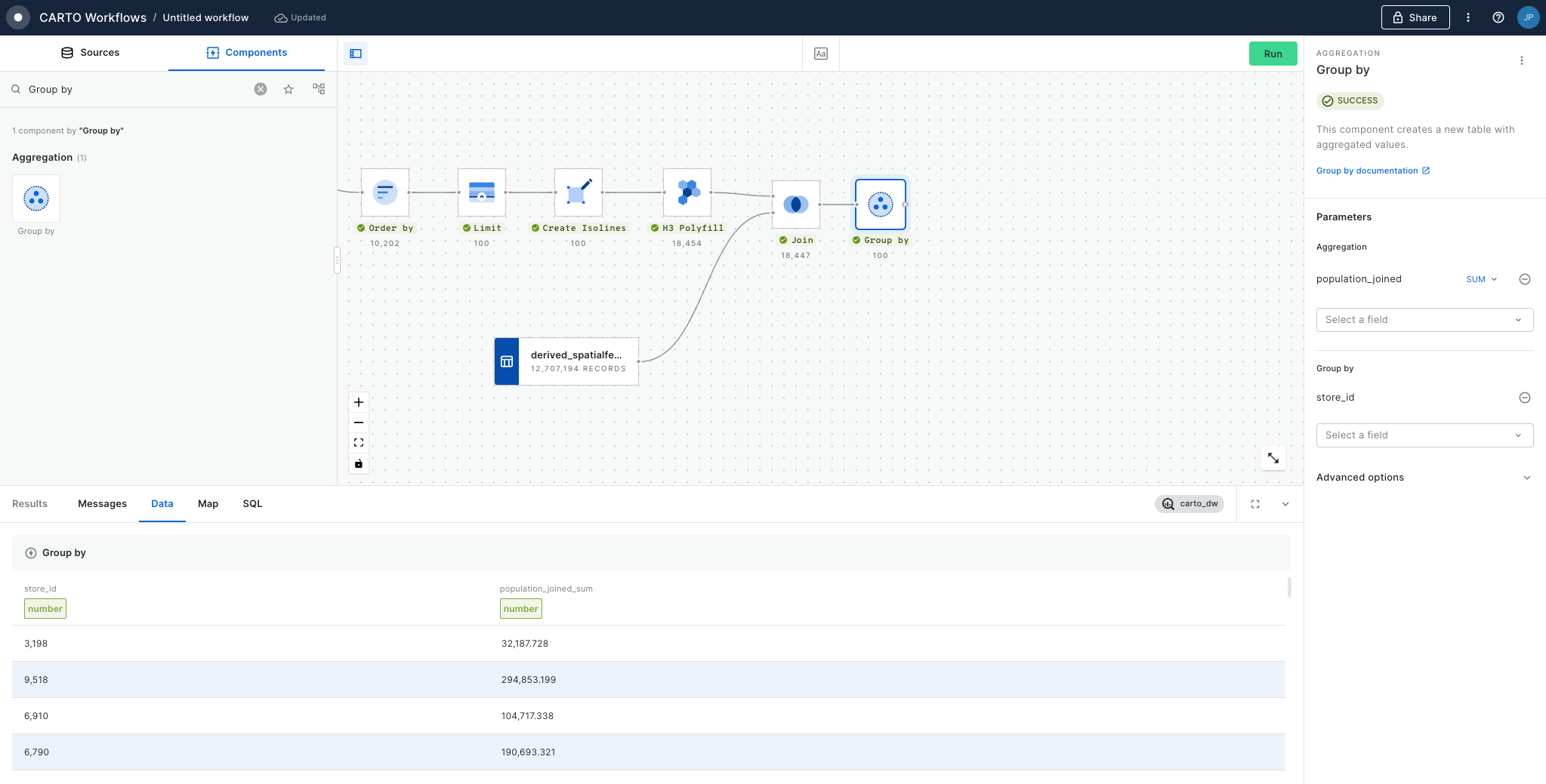 As we now have multiple H3 grid cells for each retail store, what we want to do is to aggregate the population associated with the area around each store (the H3 polyfilled isoline). In order to do that we are going to use the Group By component, and we are going to aggregate the