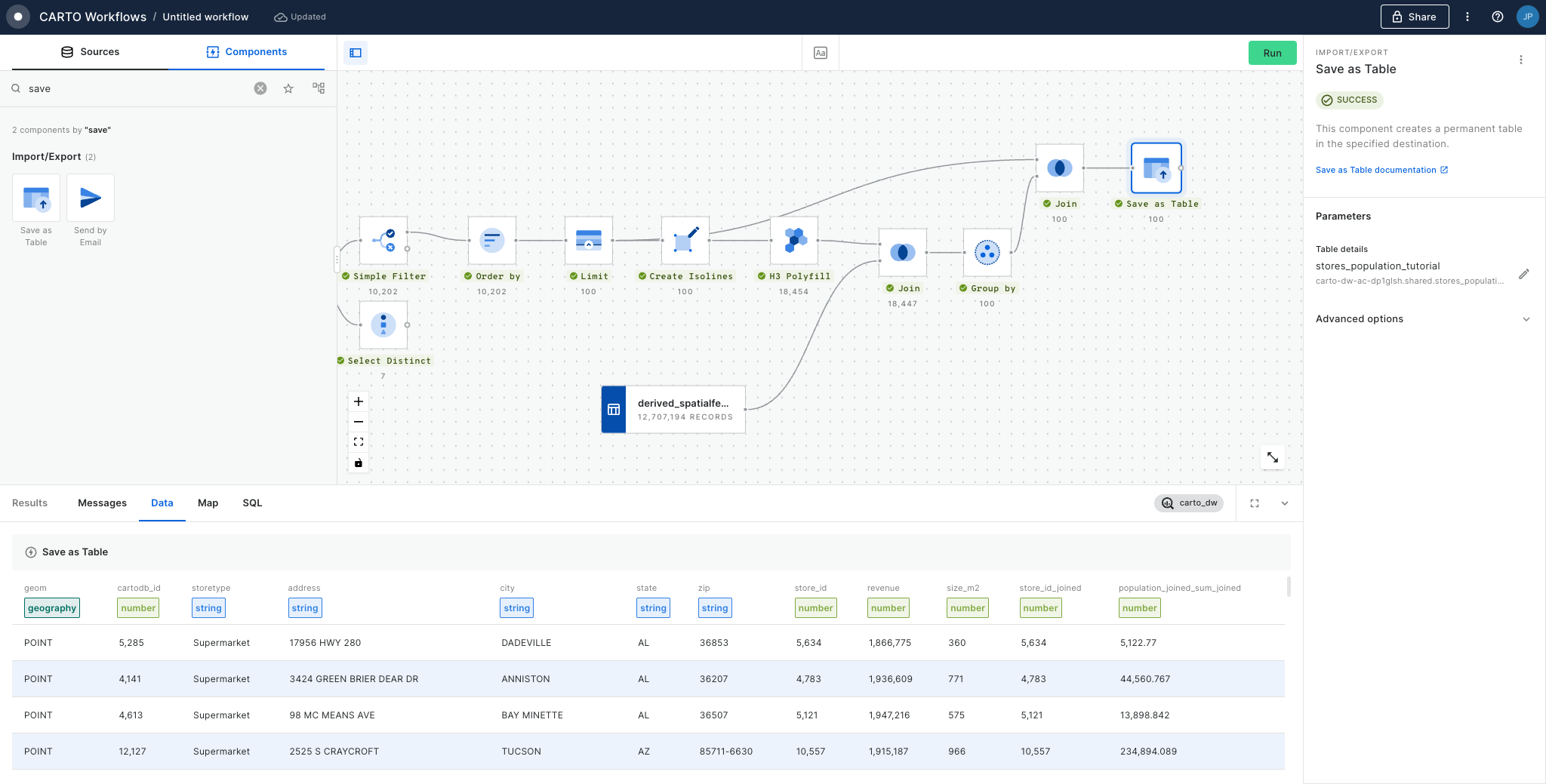 Finally we use the Save as table component to save the results as a new table in our data warehouse. We can then use the "Create map" option to build an interactive map to explore this data further.