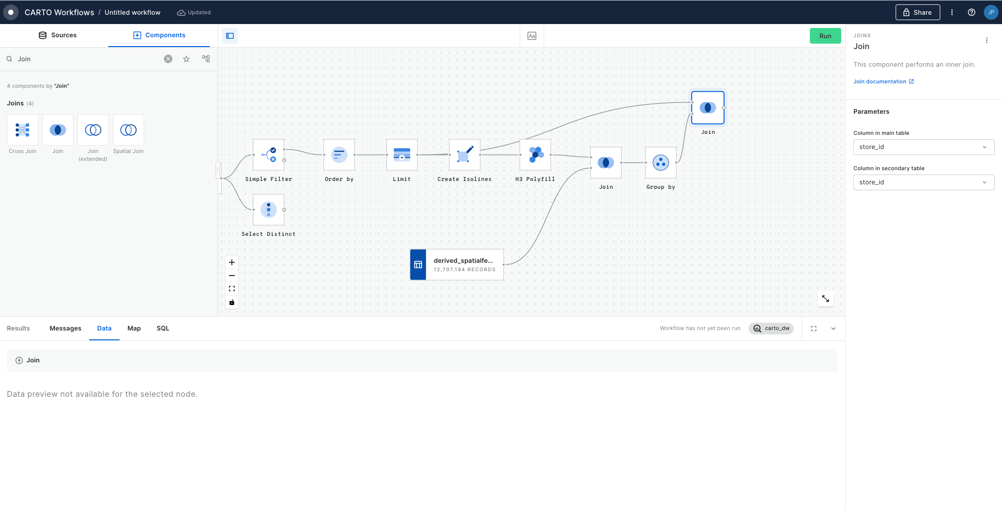 We are going to re-join with a Join component the data about the retail_stores (including the point geometry) with the aggregated population we have now. We take the output of the previous Limit component and we add it to a new Join component together with the data we generated in the previous step to perform an inner join. We will use the column