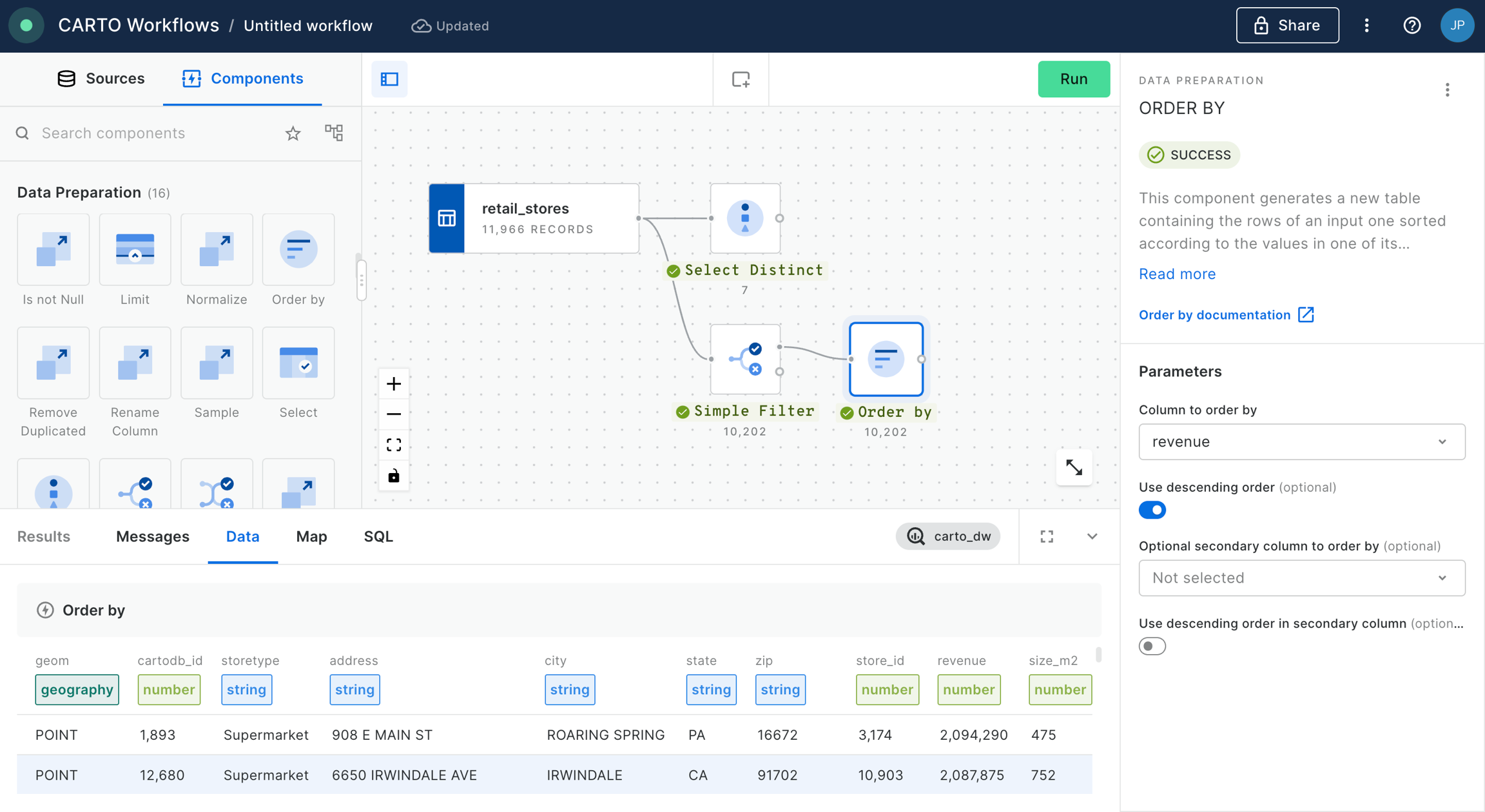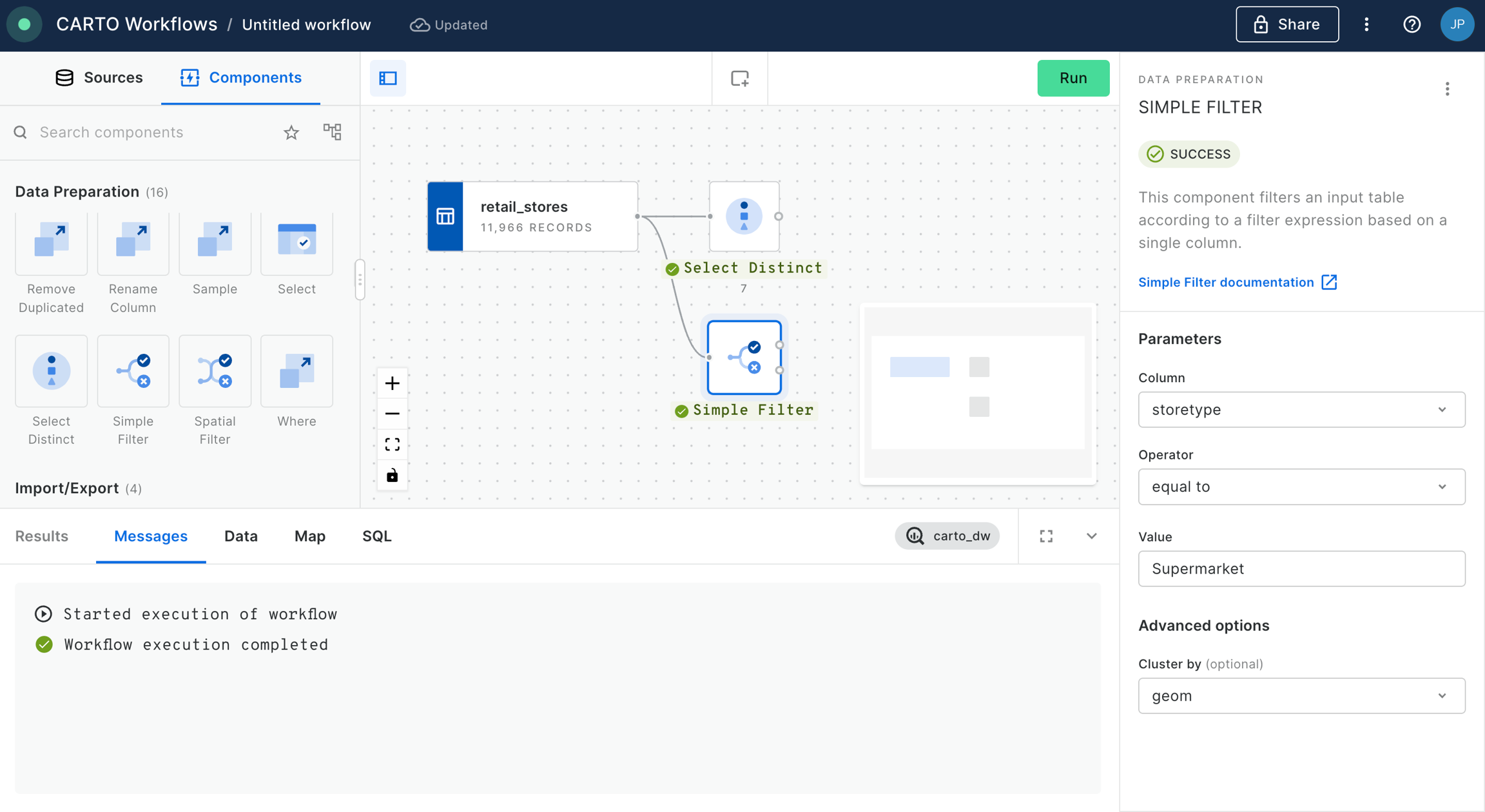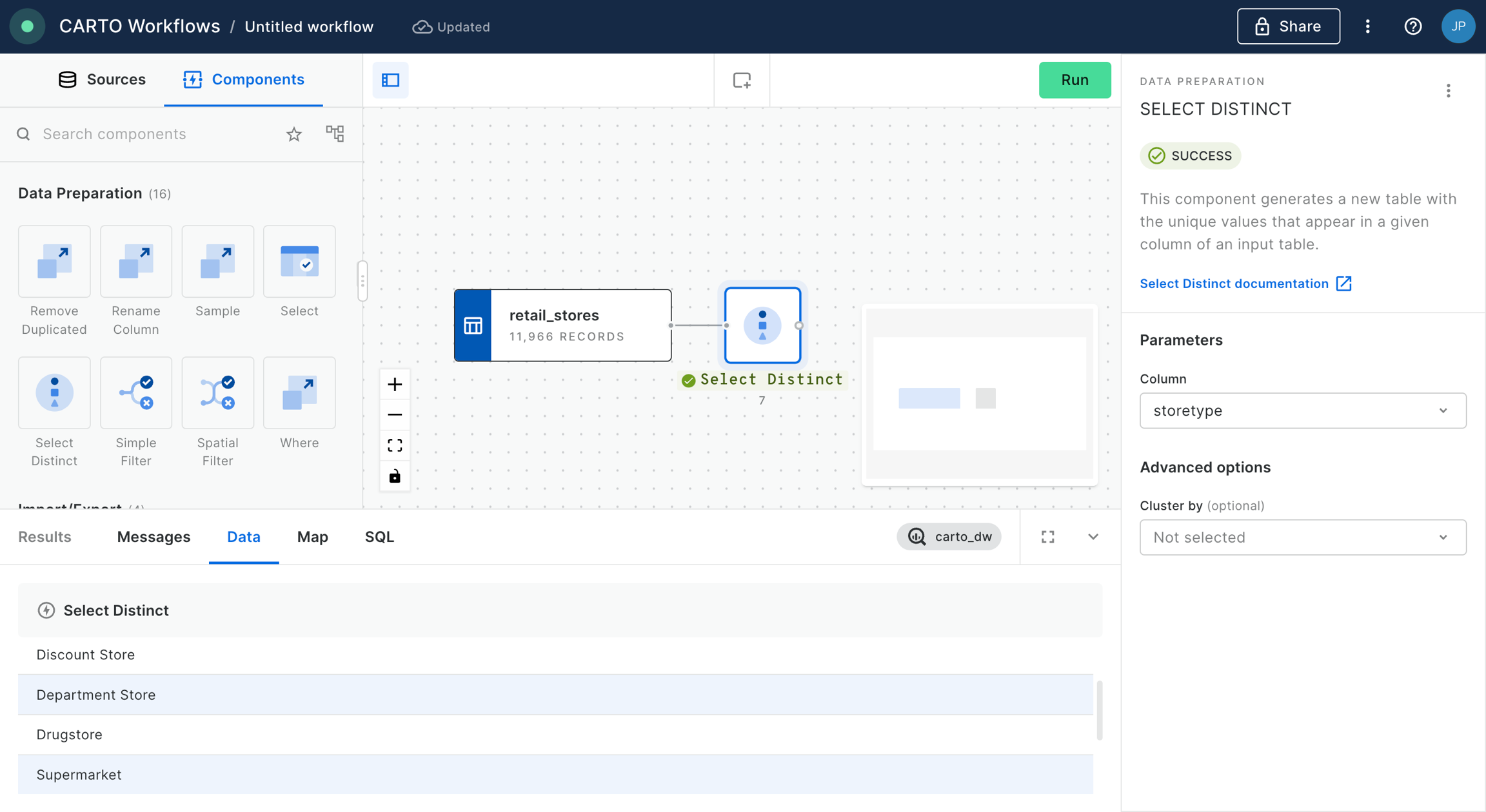 Once run, click on the Select Distinct component and switch to the data preview at the bottom of the window. You will see a list of all distinct store type values. In this example, let’s say we’re only interested in supermarkets.