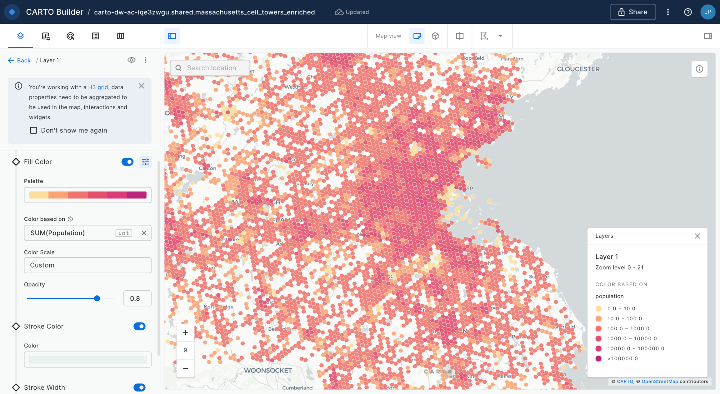 We can add “Interactions” to the map, so as to open pop-up windows when the user clicks or hovers over the H3 cells.