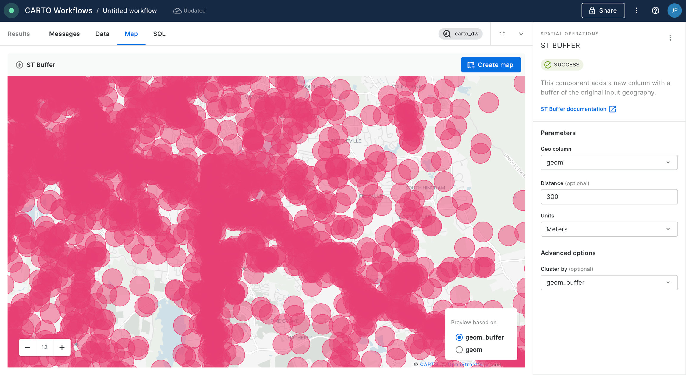 You can preview the result of the analysis by clicking on the last node of the “ST Buffer” and preview the result on map.