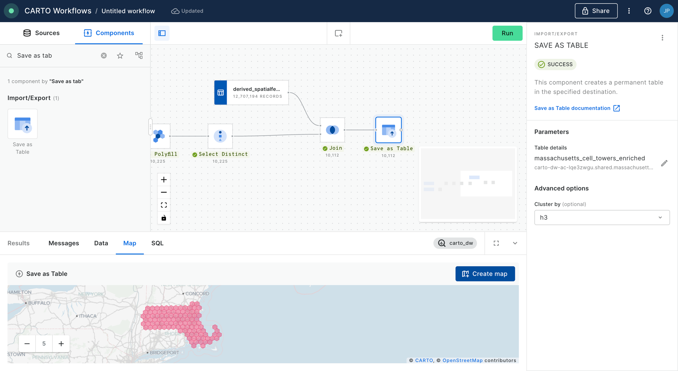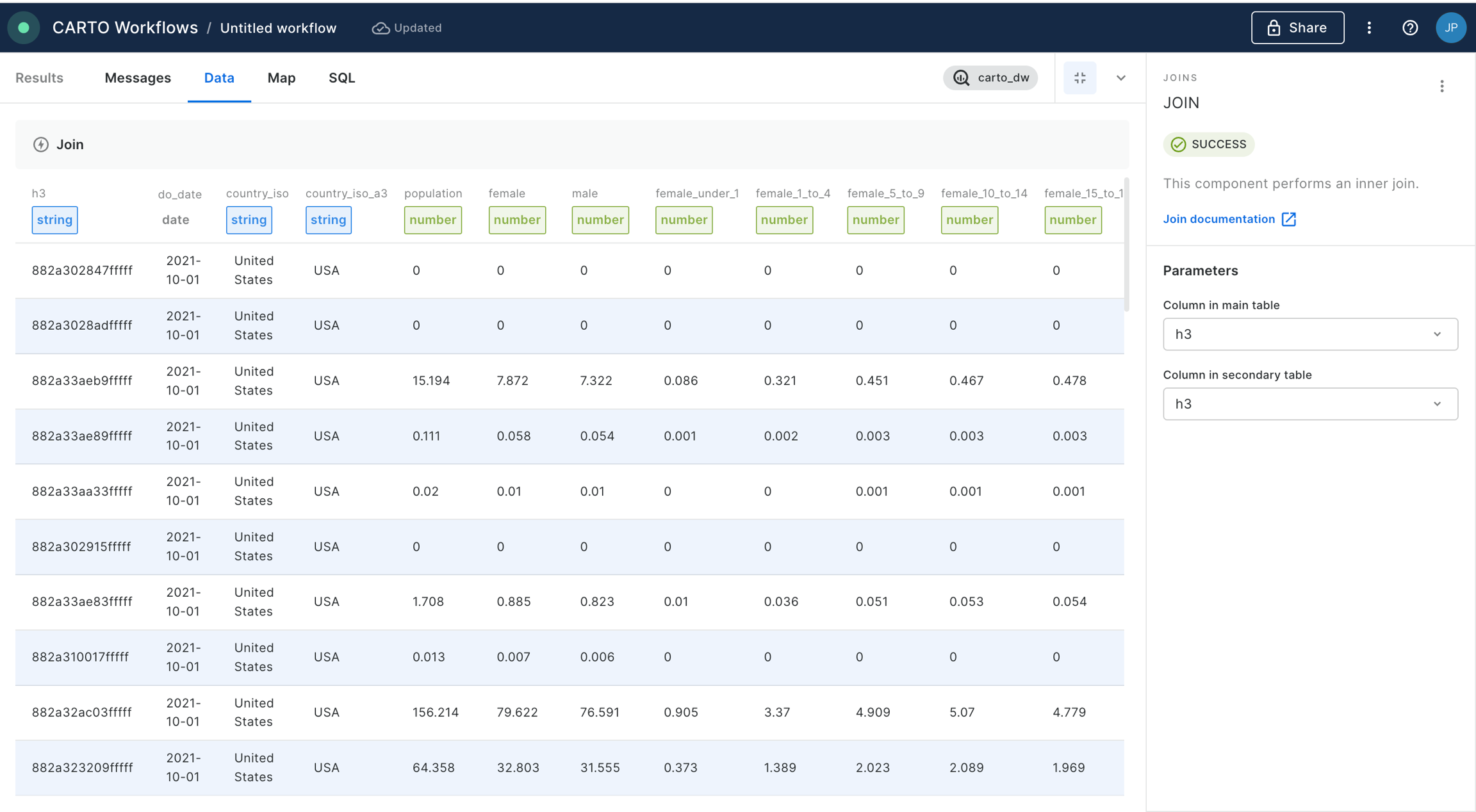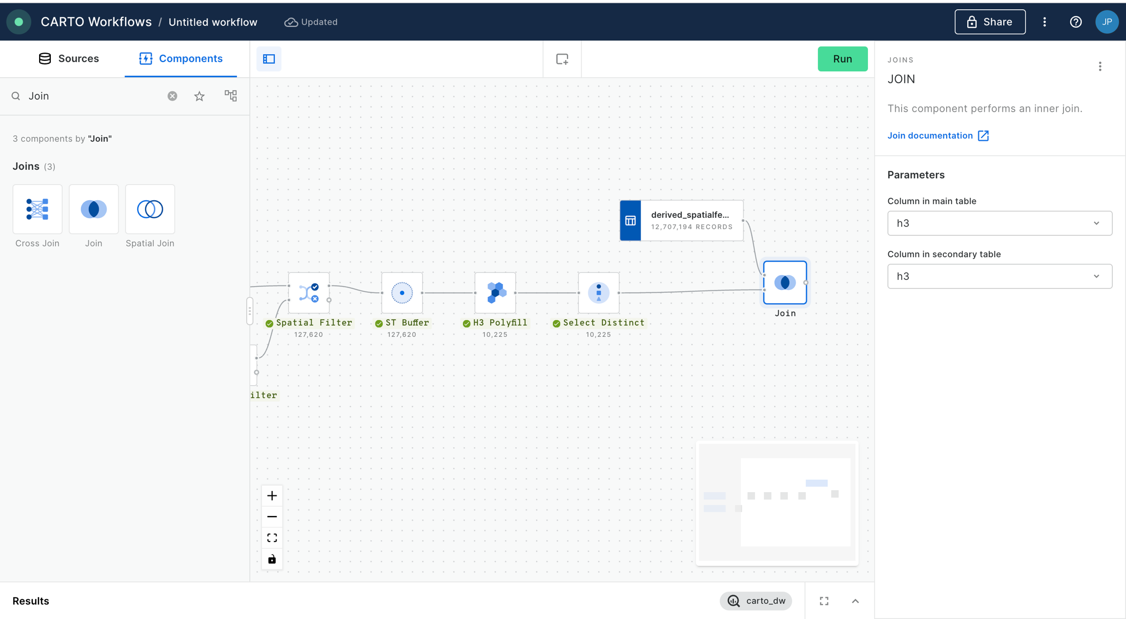 We add a “Join” component in order to perform an inner join between the data from the Spatial Features dataset and the output of our workflow so far, based on the h3 indices present in both tables. Click “Run”.