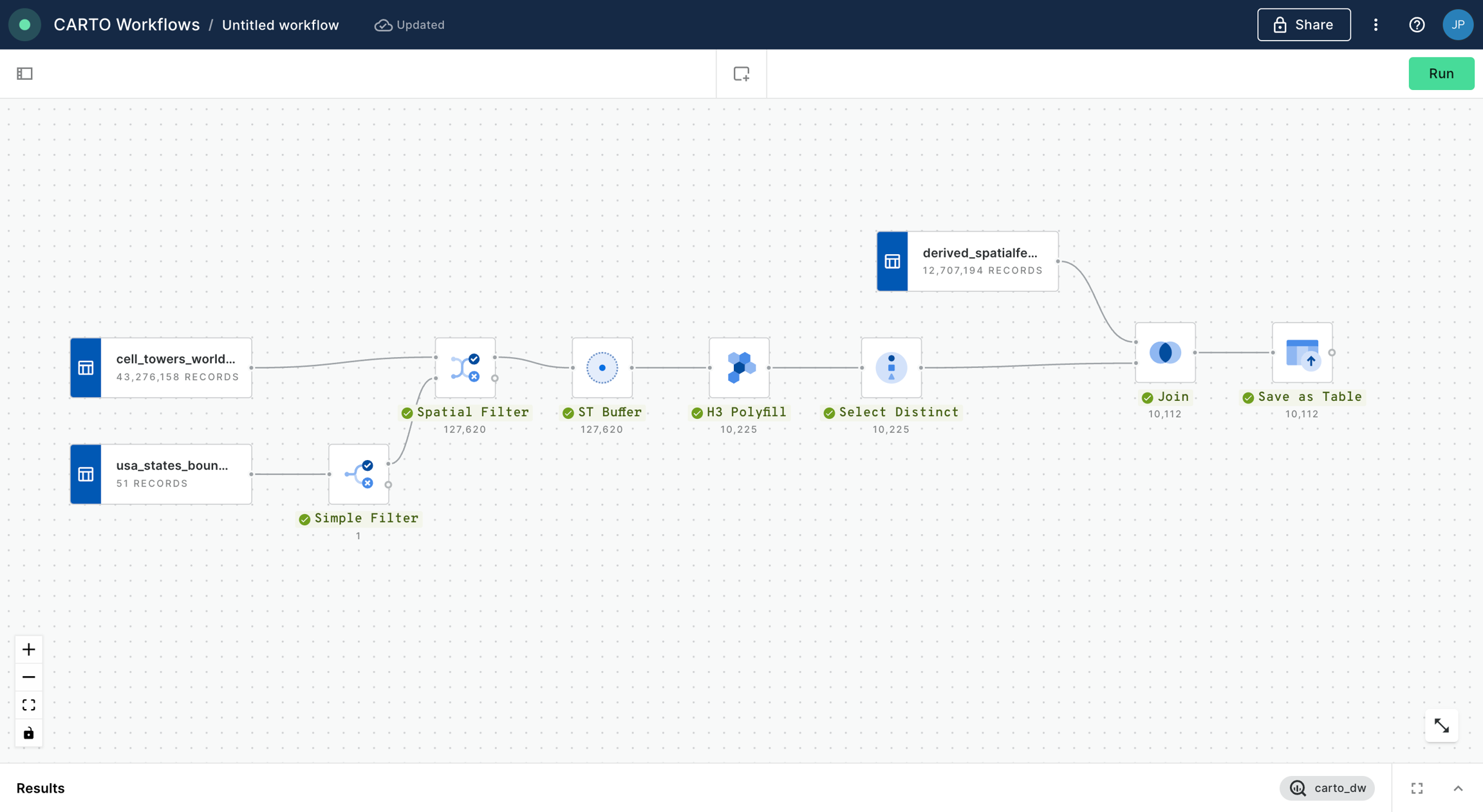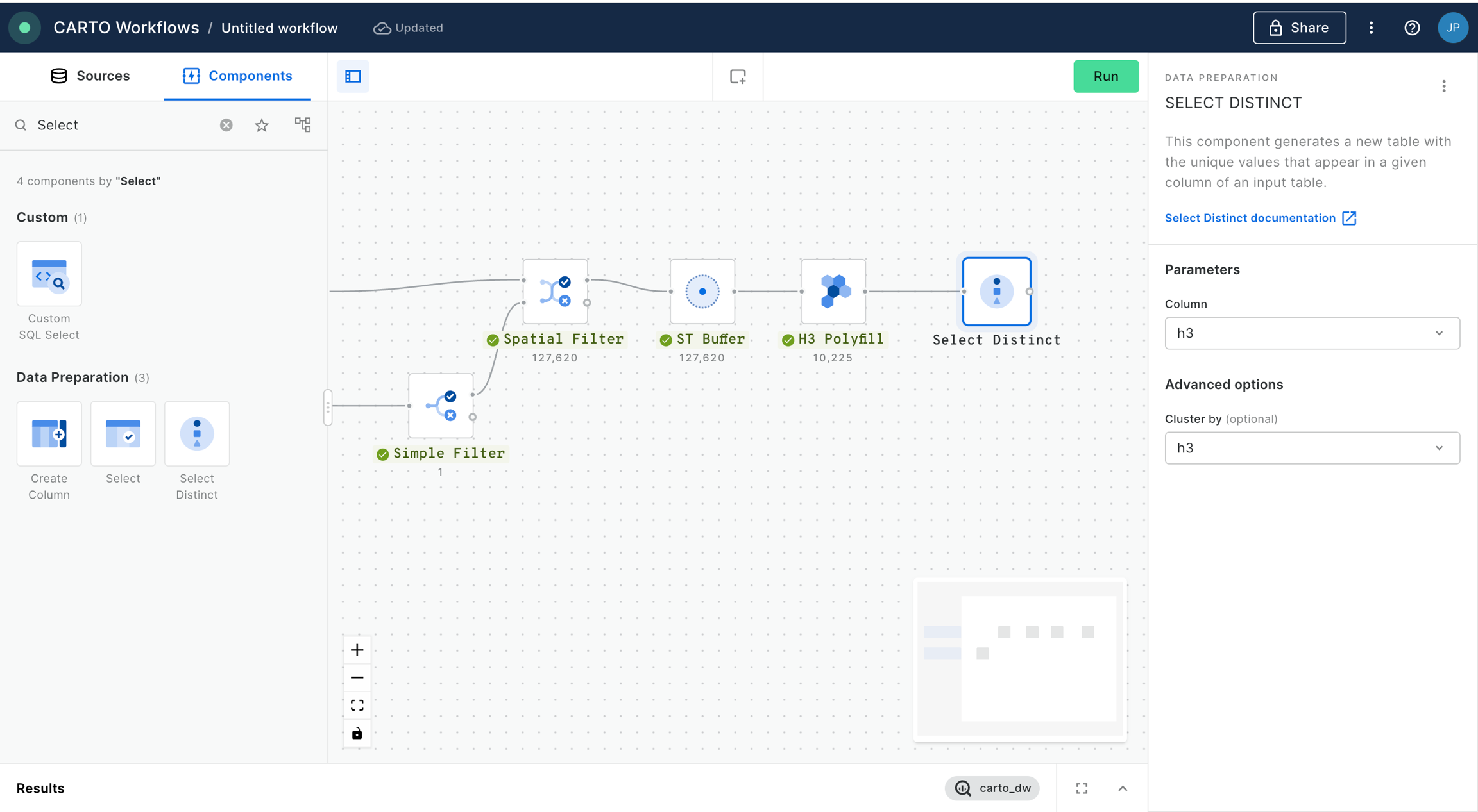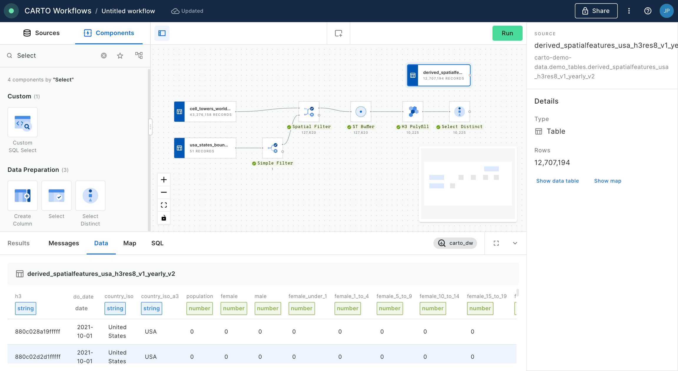 We add a “Join” component in order to perform an inner join between the data from the Spatial Features dataset and the output of our workflow so far, based on the h3 indices present in both tables. Click “Run”.