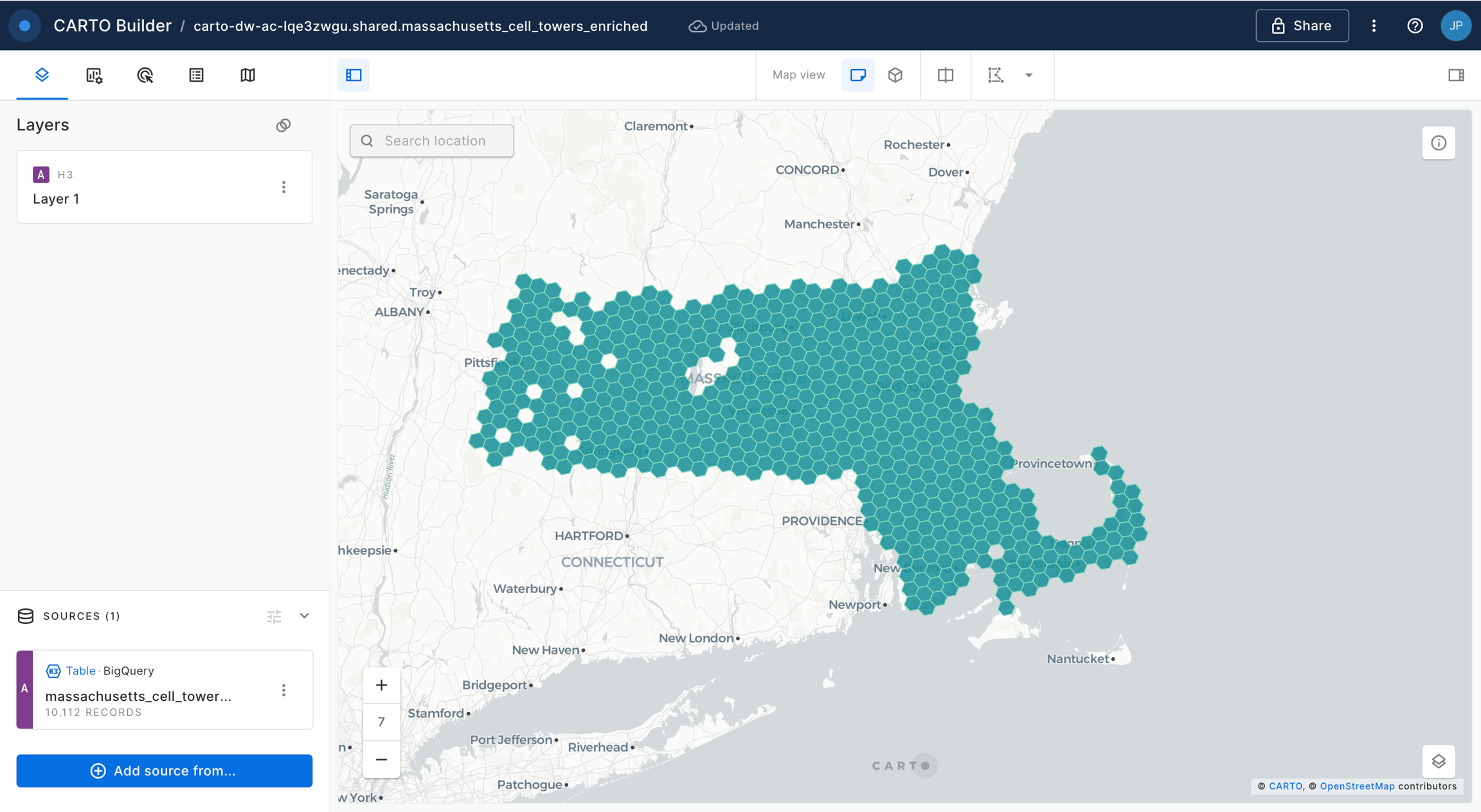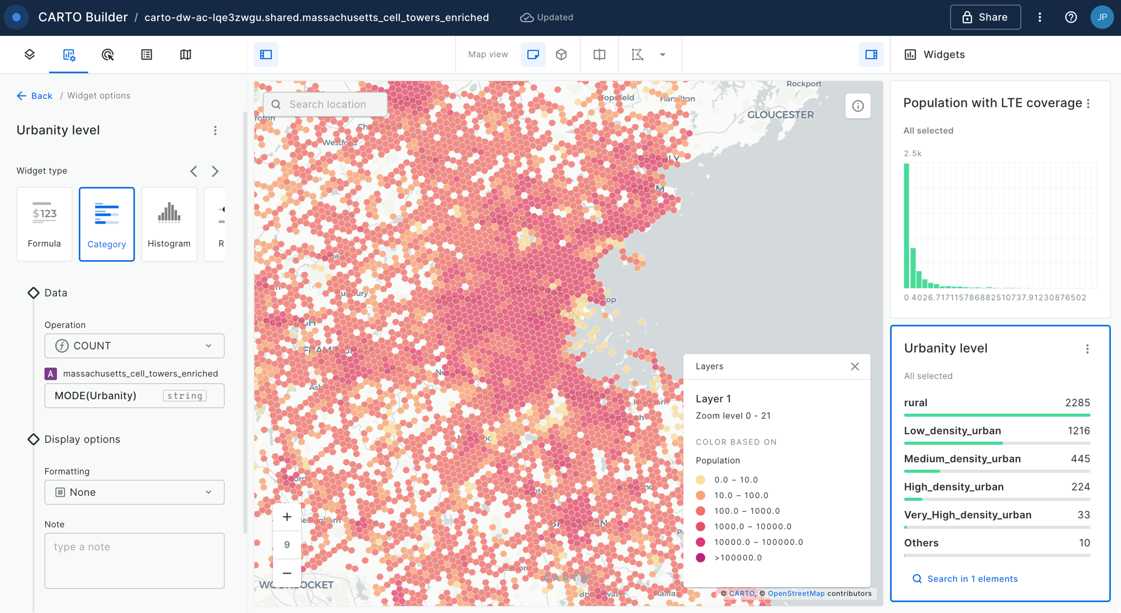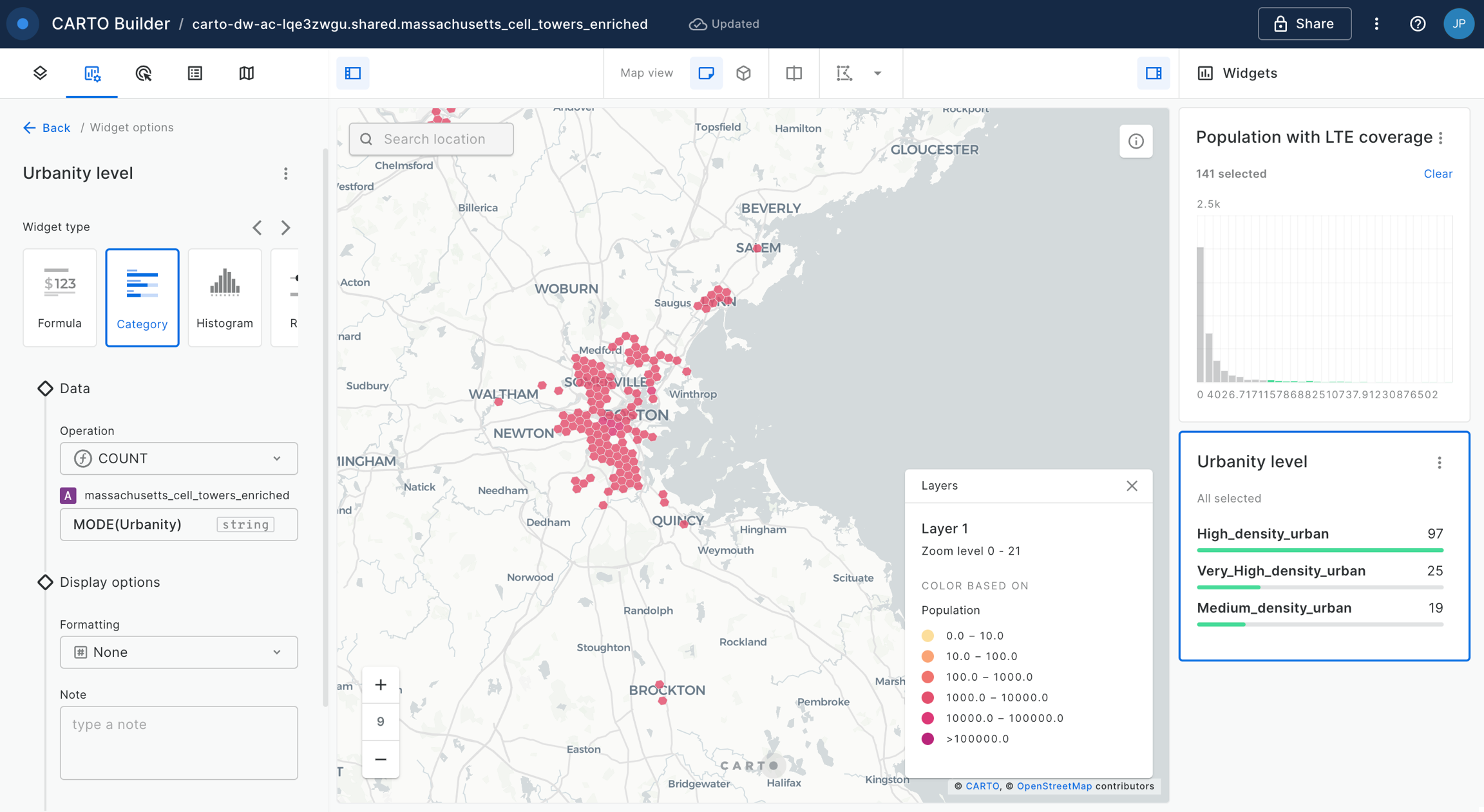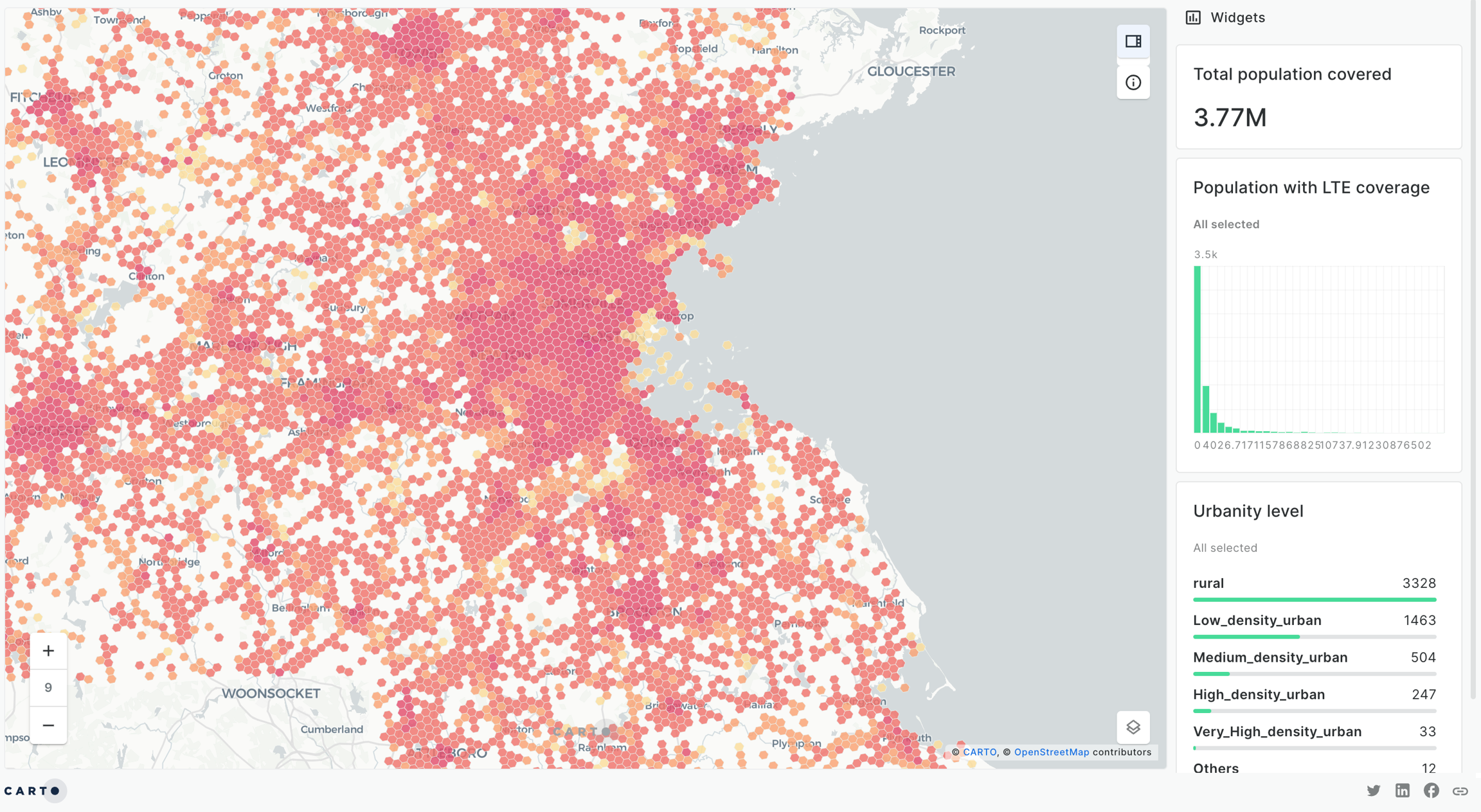 We can now start interacting with the map. Check how, for example, the area with more population covered by LTE cells is concentrated in the Boston area (which are mostly quite dense urban areas).
