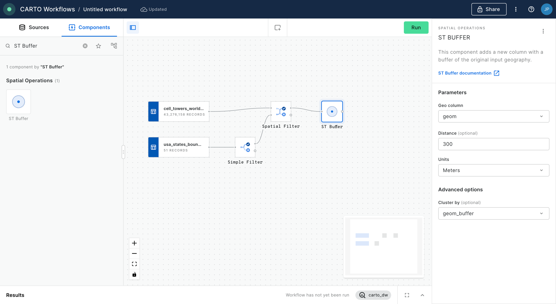 We are now going to create a buffer around each of the cell towers. For that, we add the “ST Buffer” component into the canvas. We configure that node to generate buffers of 300 meters. We click “Run”.