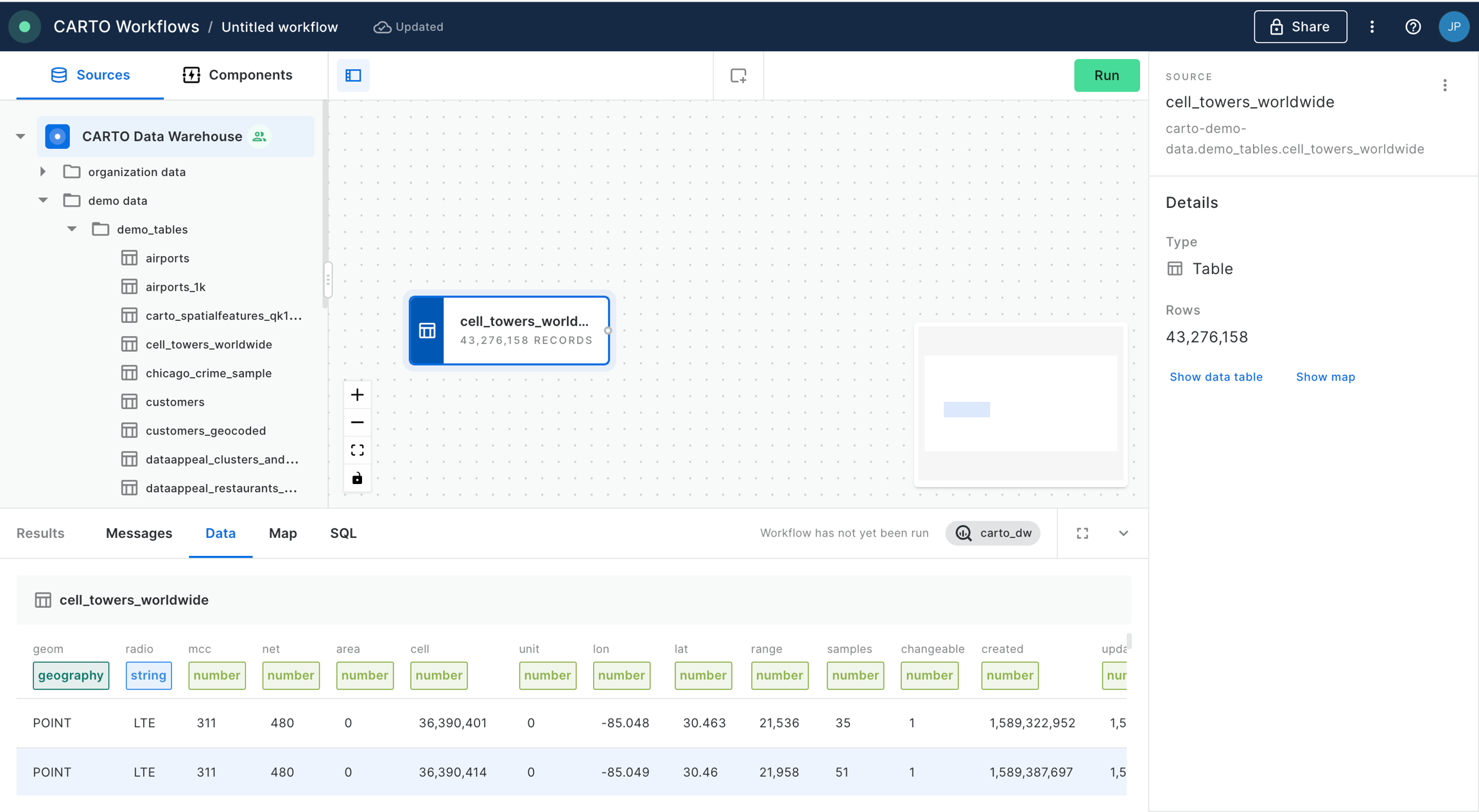 cell_towers_worldwidetable available in demo data. You should be able to preview the data both in tabular and map format.
