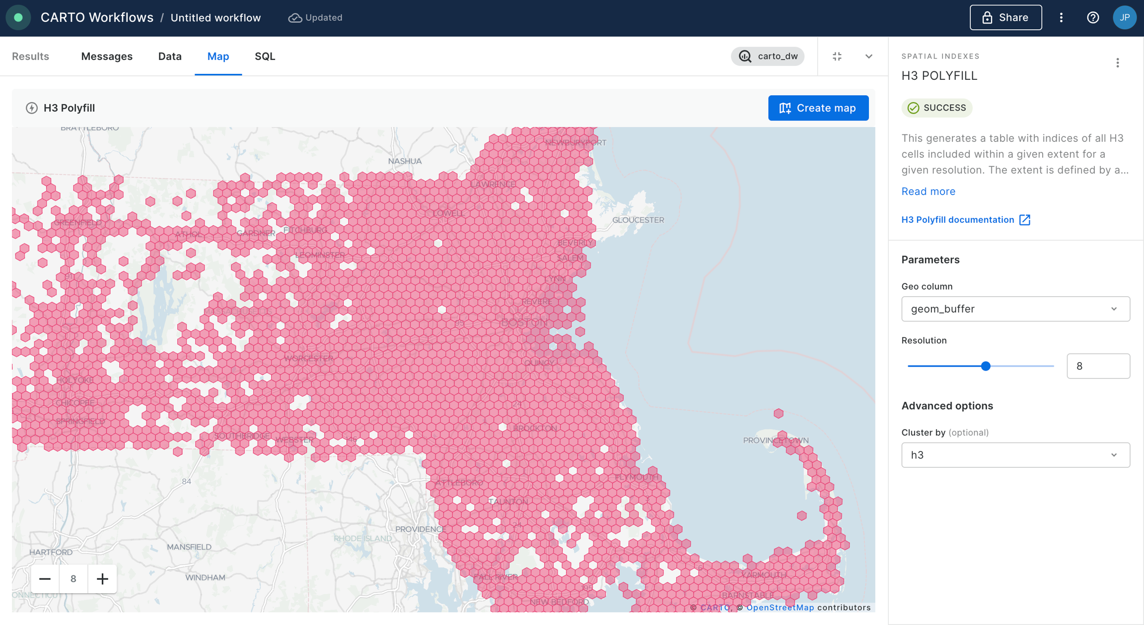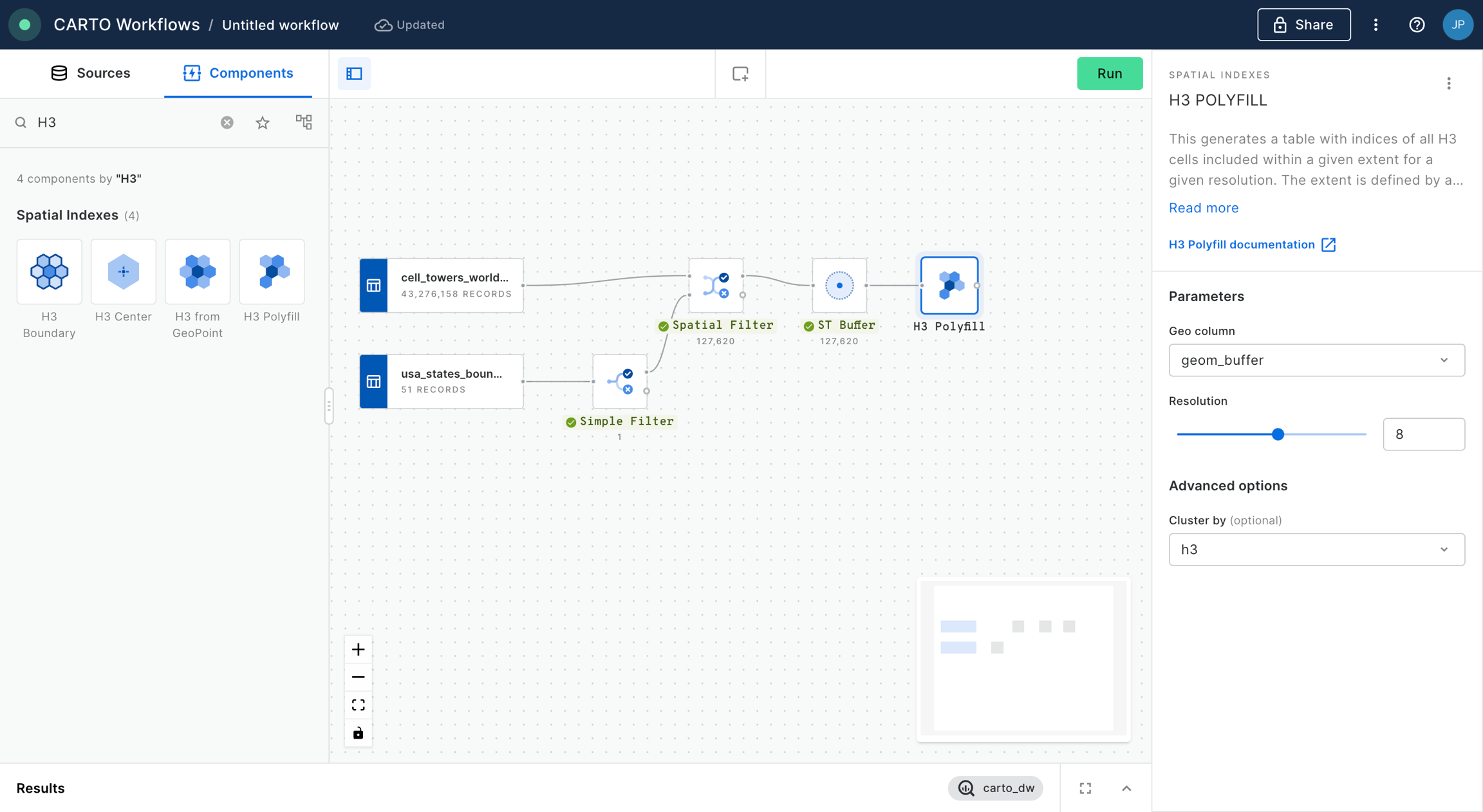 Now, we are going to polyfill the different buffers with H3 cells. For that we add the component “H3 Polyfill” and we configure the node to be based on cells of resolution 8, we select the geom_buffer as the geometry data to be polyfilled and we cluster the output based on the H3 indices. We then click “Run” again.