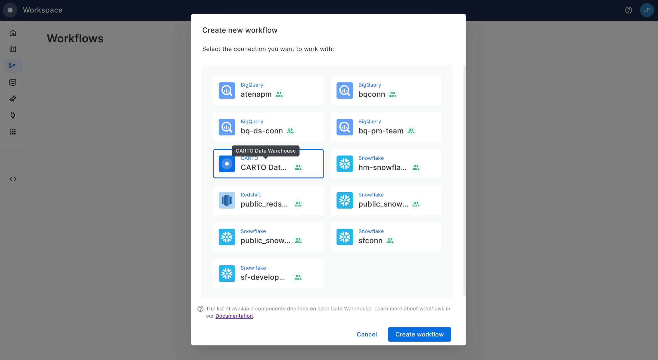 Select the data warehouse where you have the data accessible. We'll be using the CARTO Data Warehouse, which should be available to all users.