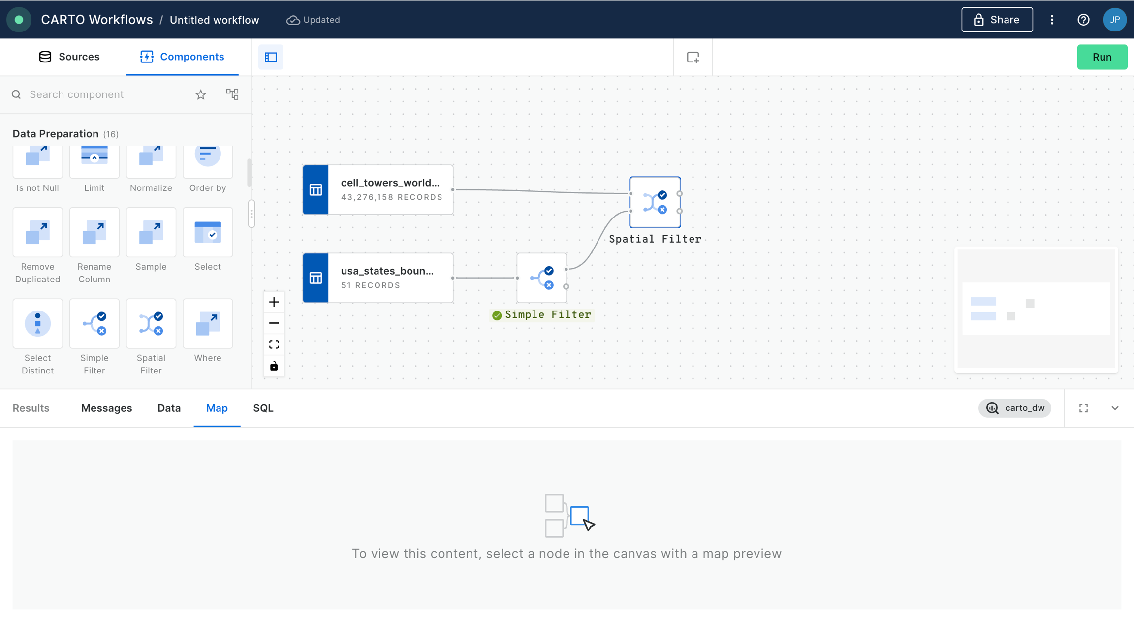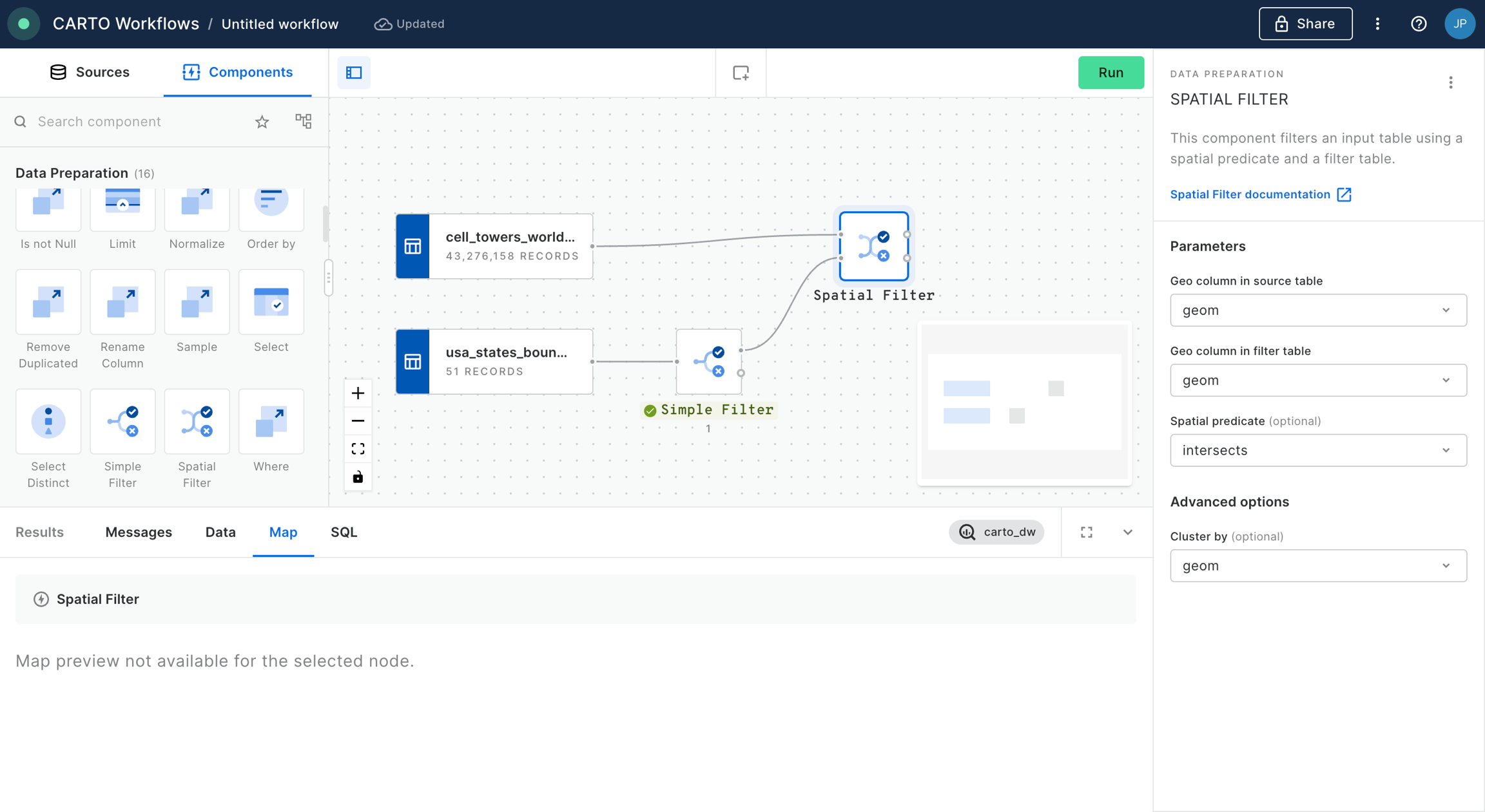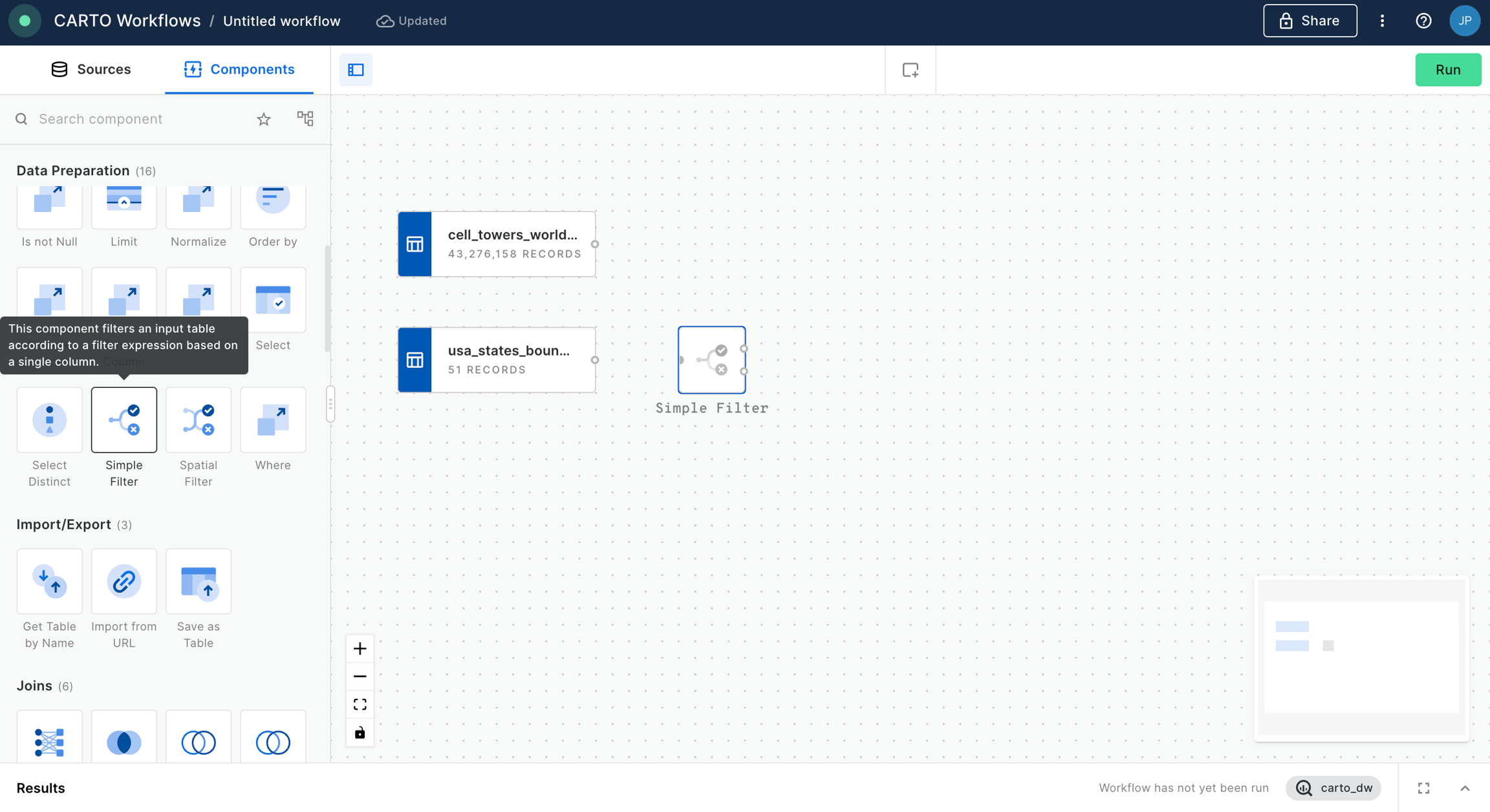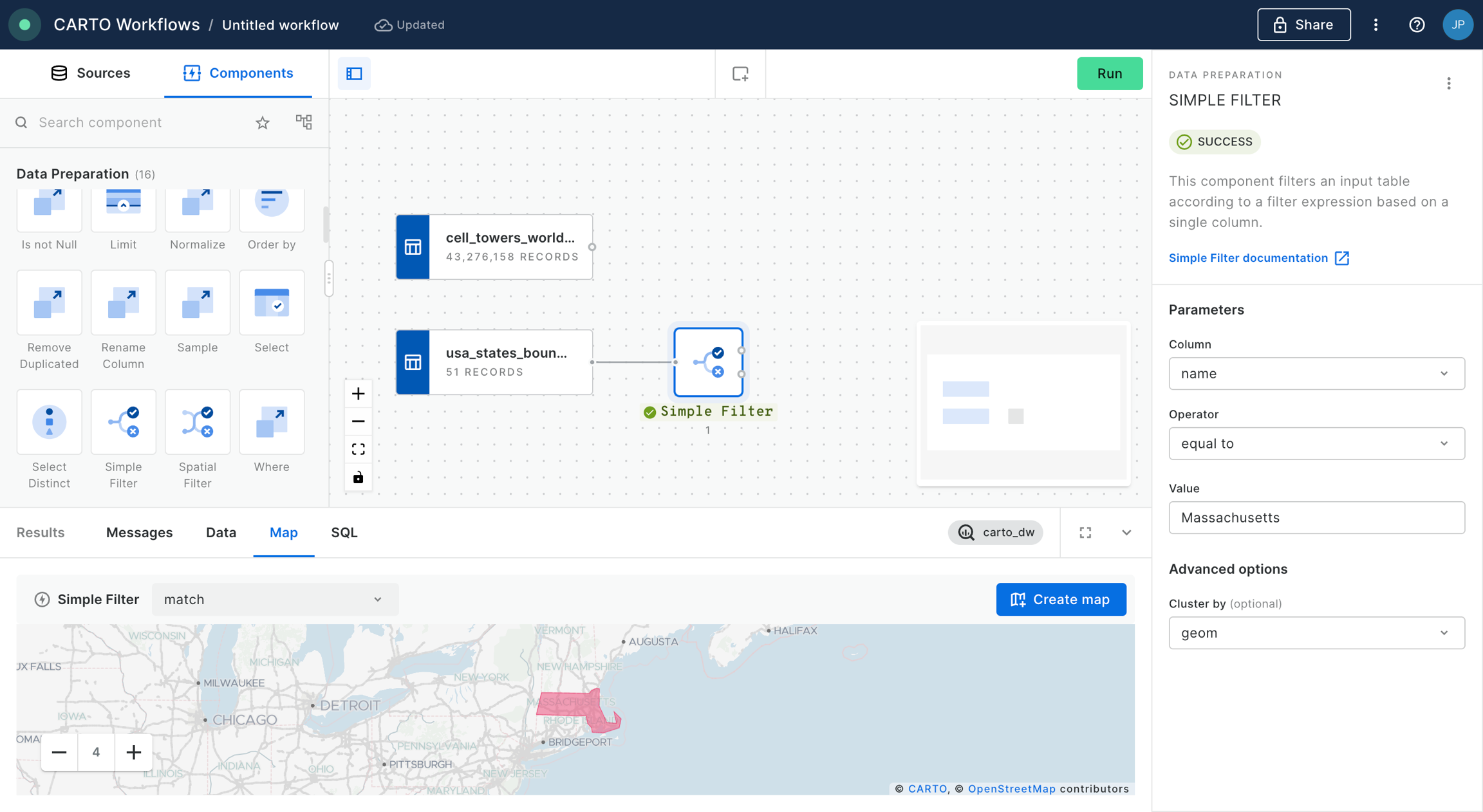 usa_states_boundariestable we will be using the component “Simple Filter”, which we should now also drag and drop into the canvas and connect the data source to the component node.